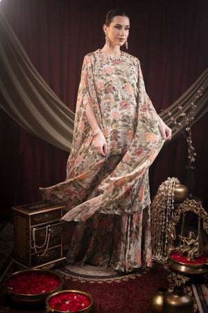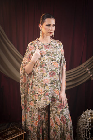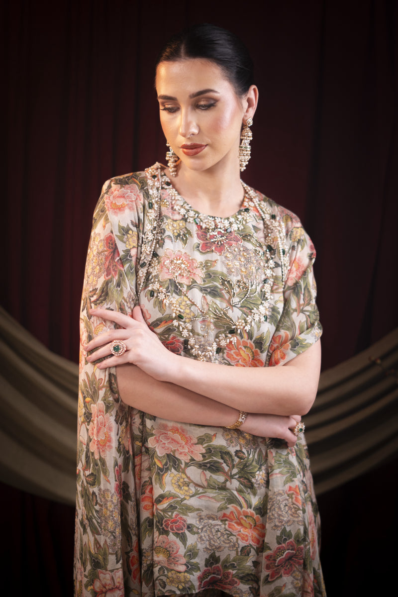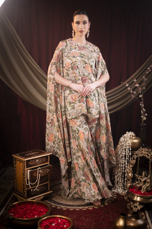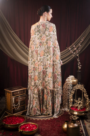 This sharara set with cape is fully embroidered with green stones, dull gold chid, cut dana, pearls, Moti etc.