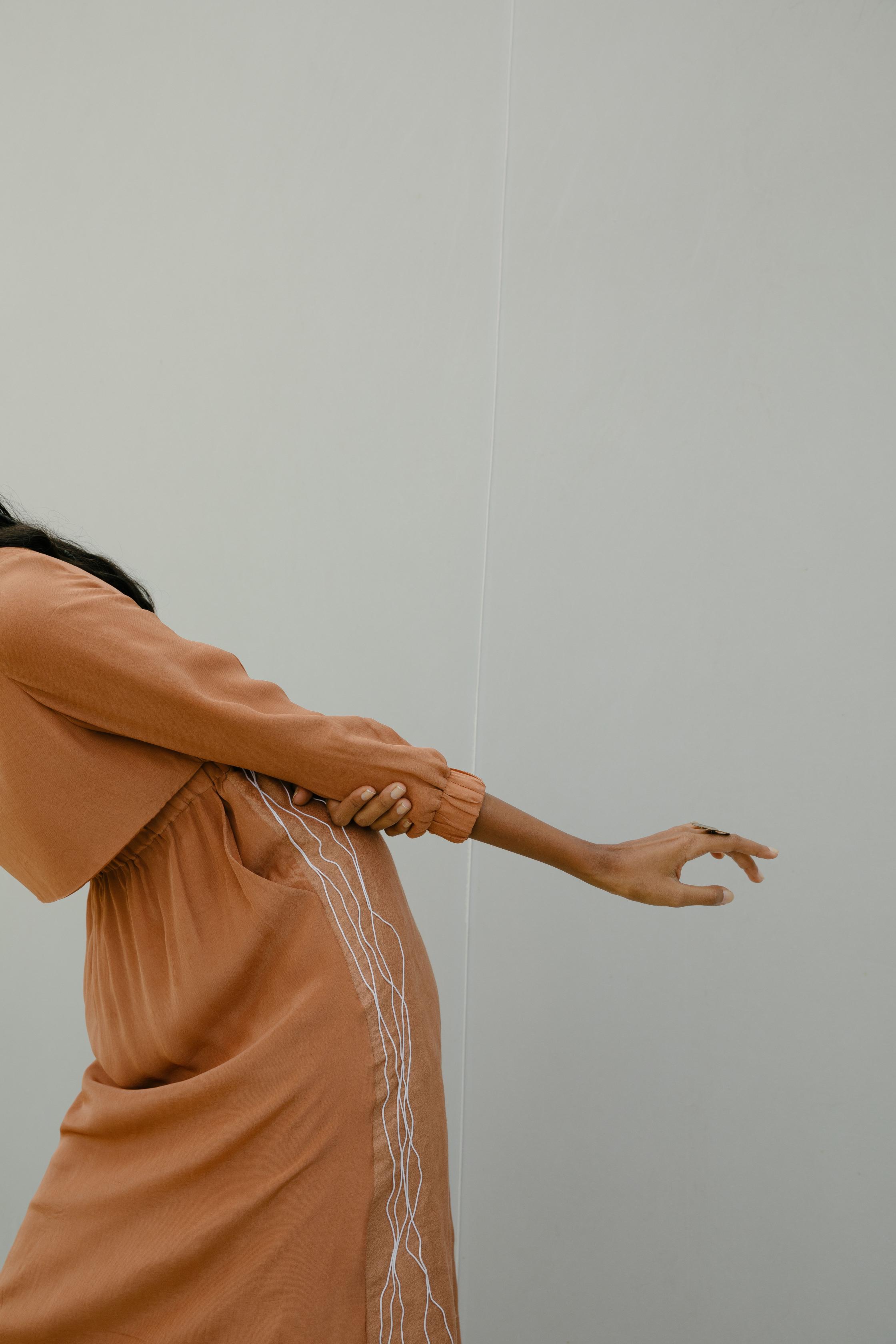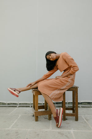 Autumn Dusk dress with hand-embroidered cotton cord lines. Elasticated at the waist.