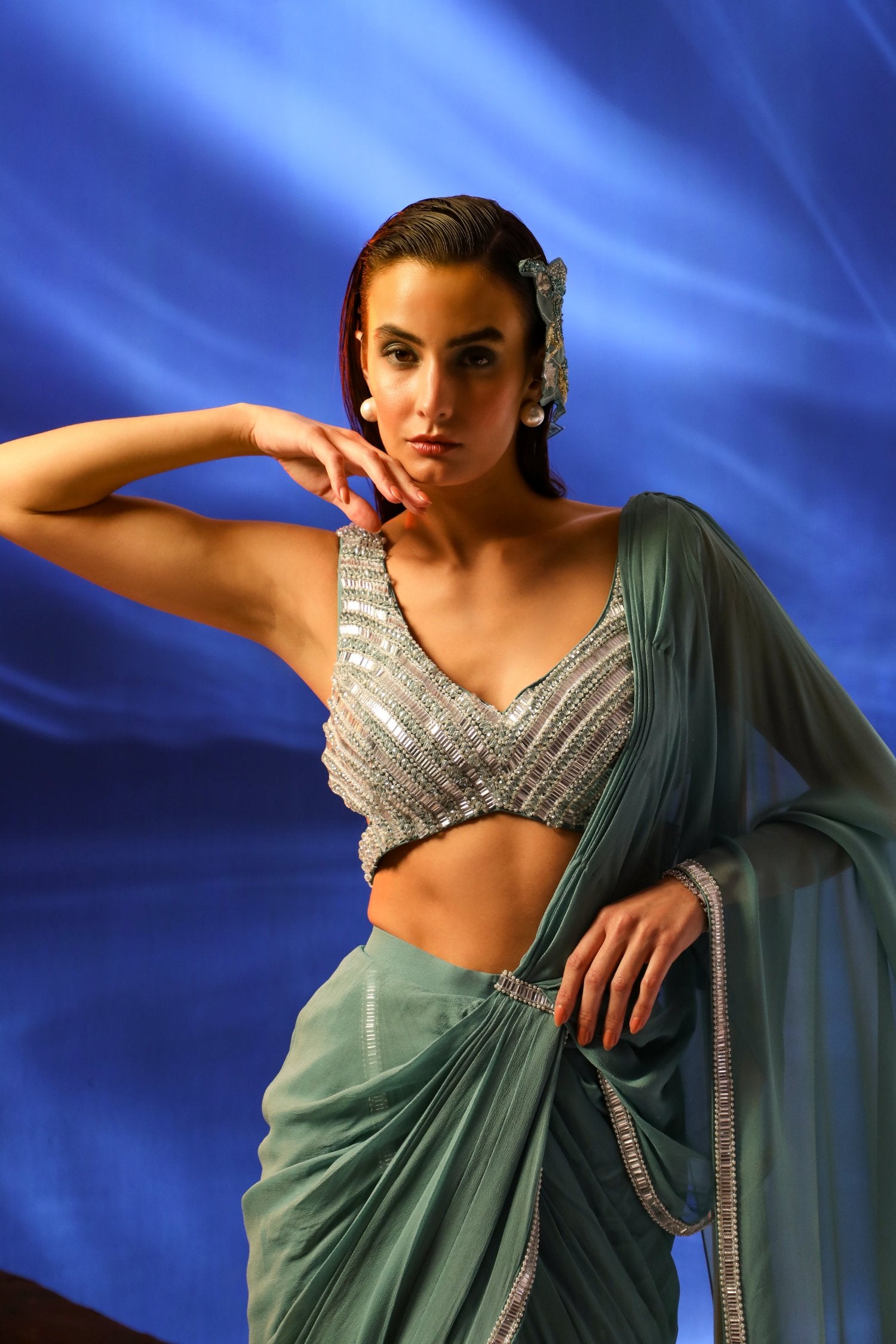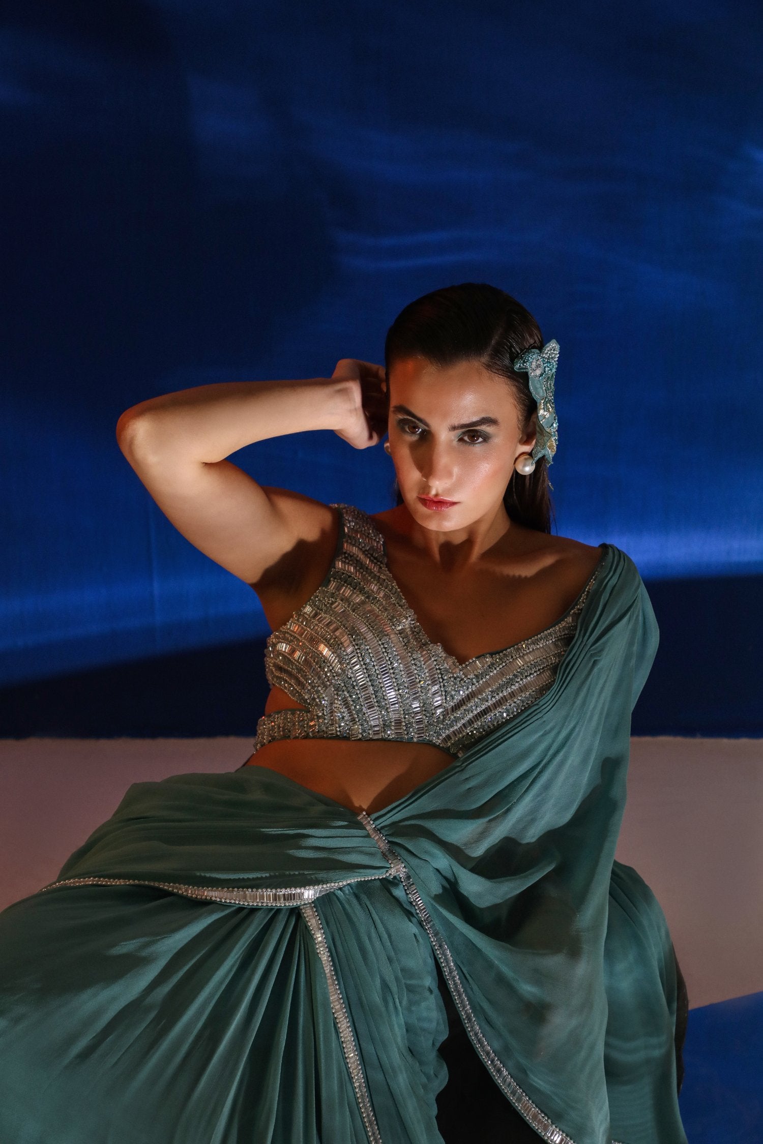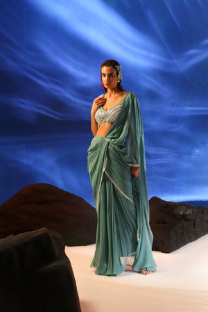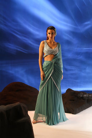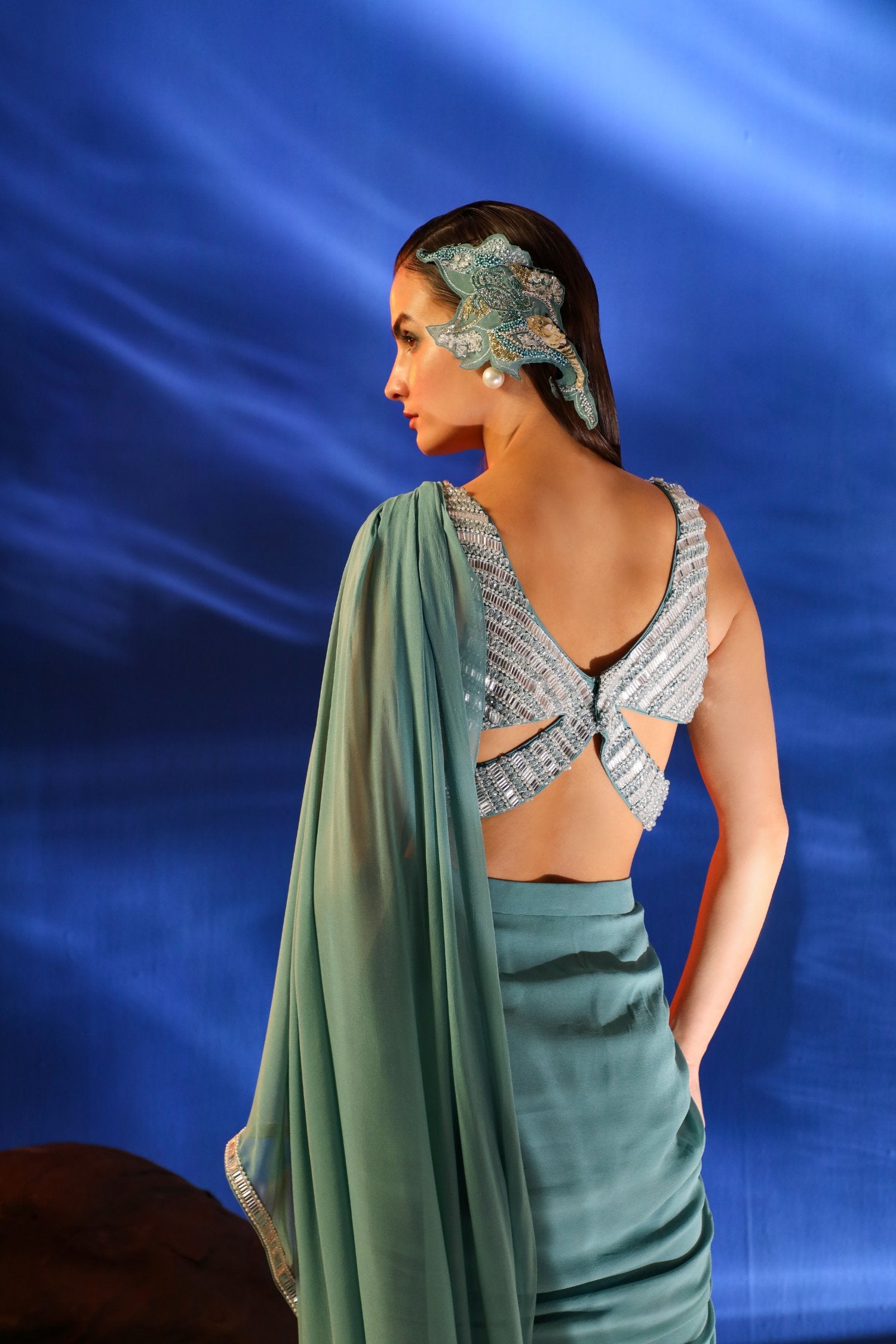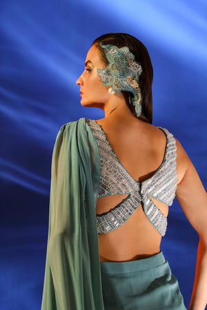 Designed in a tiffany blue tone, the Ava Jade saree is a one-of-a-kind ensemble. Inspired by the magnificient marine life, the cut-out blouse highlights intriguing embroidery complementing a classic drape saree.