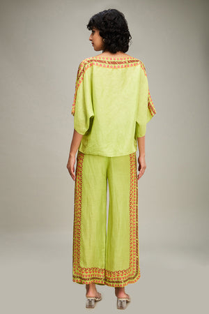 Green Avain Canopy Embellished Kimono Top with Curved Hem Pants in Linen.