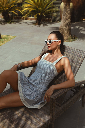 A cute sleeveless mini dress featuring blue and white stripes, perfect for a fresh and summery look.