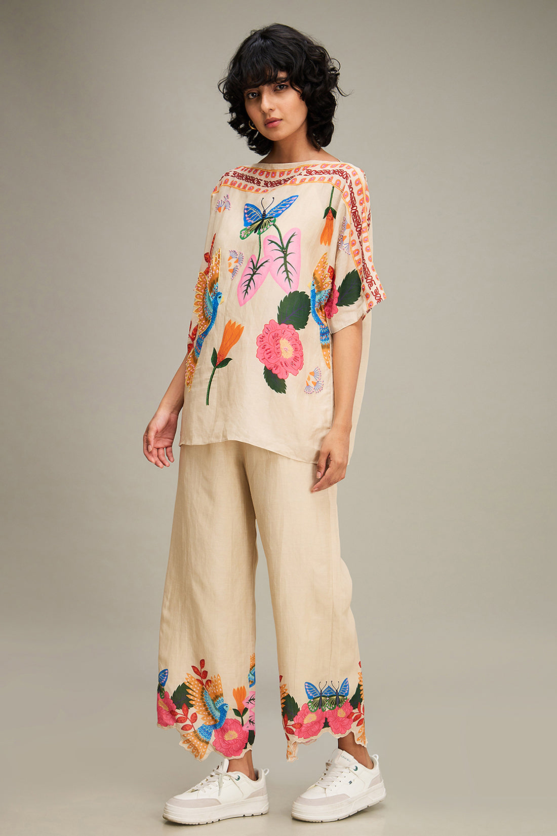 Beige Avian Canopy Kimono Top with Cutworked Hem in Linen.