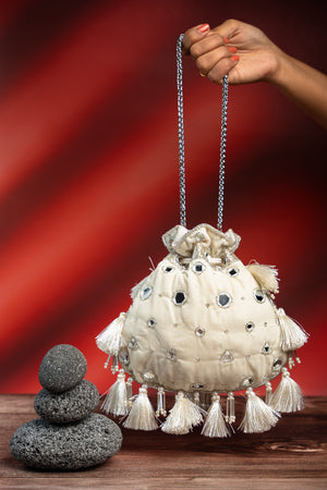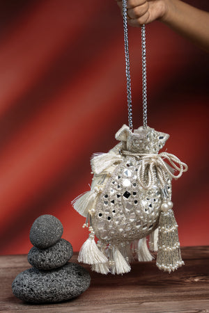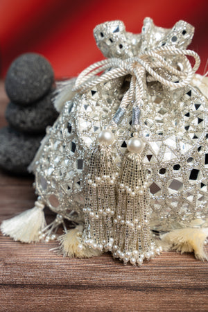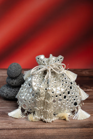 a striking accessory featuring a blend of mirror and abla work in gold, beautifully accented with a silverish finishing. The potli is completed with intricate bead work, making it a perfect choice for adding a touch of sophistication to any special occasion.
