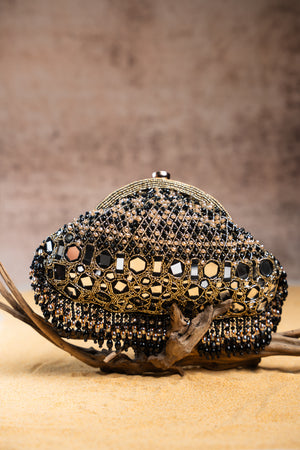a stunning blend of tradition and elegance. This clutch is adorned with sparkling mirrors, pearls and intricate bead work, all in a sophisticated black hue. The mirror finishing adds a luxurious touch, while the beadwork brings a playful yet elegant flair. Perfect for special occasions, this potli is designed to catch the light and elevate your ensemble.