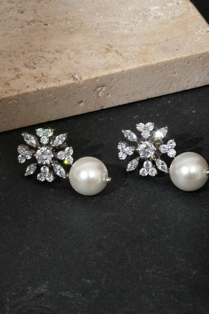 Embrace elegance with these Floral Diamond-Look Earrings with Pearls, designed to add a touch of sophistication to any outfit. Featuring a delicate flower-shaped design adorned with sparkling diamond-like stones, these earrings exude timeless beauty. A lustrous pearl drop enhances their charm, creating the perfect blend of glamour and grace.