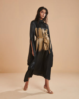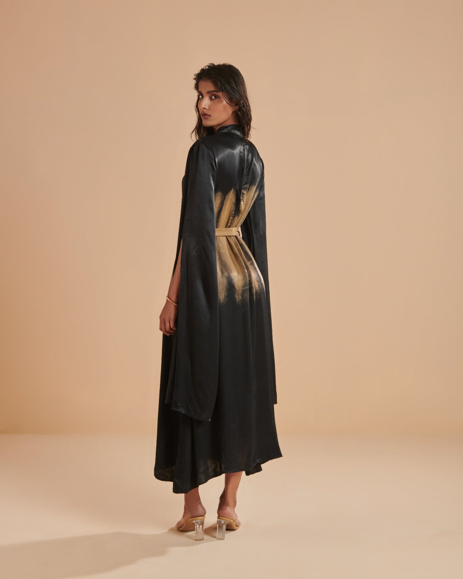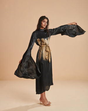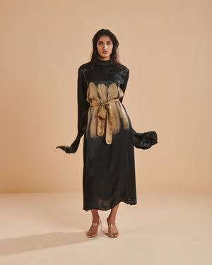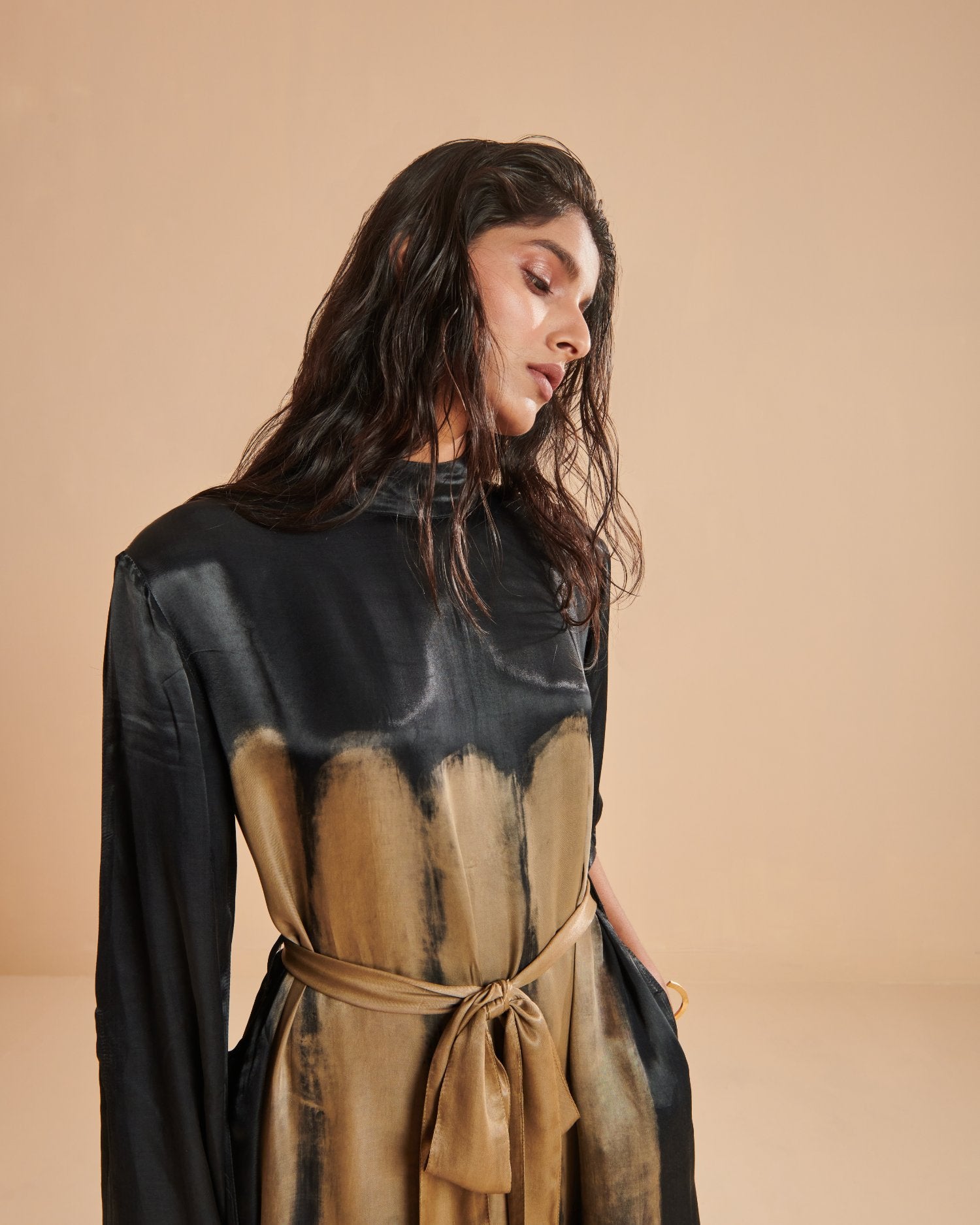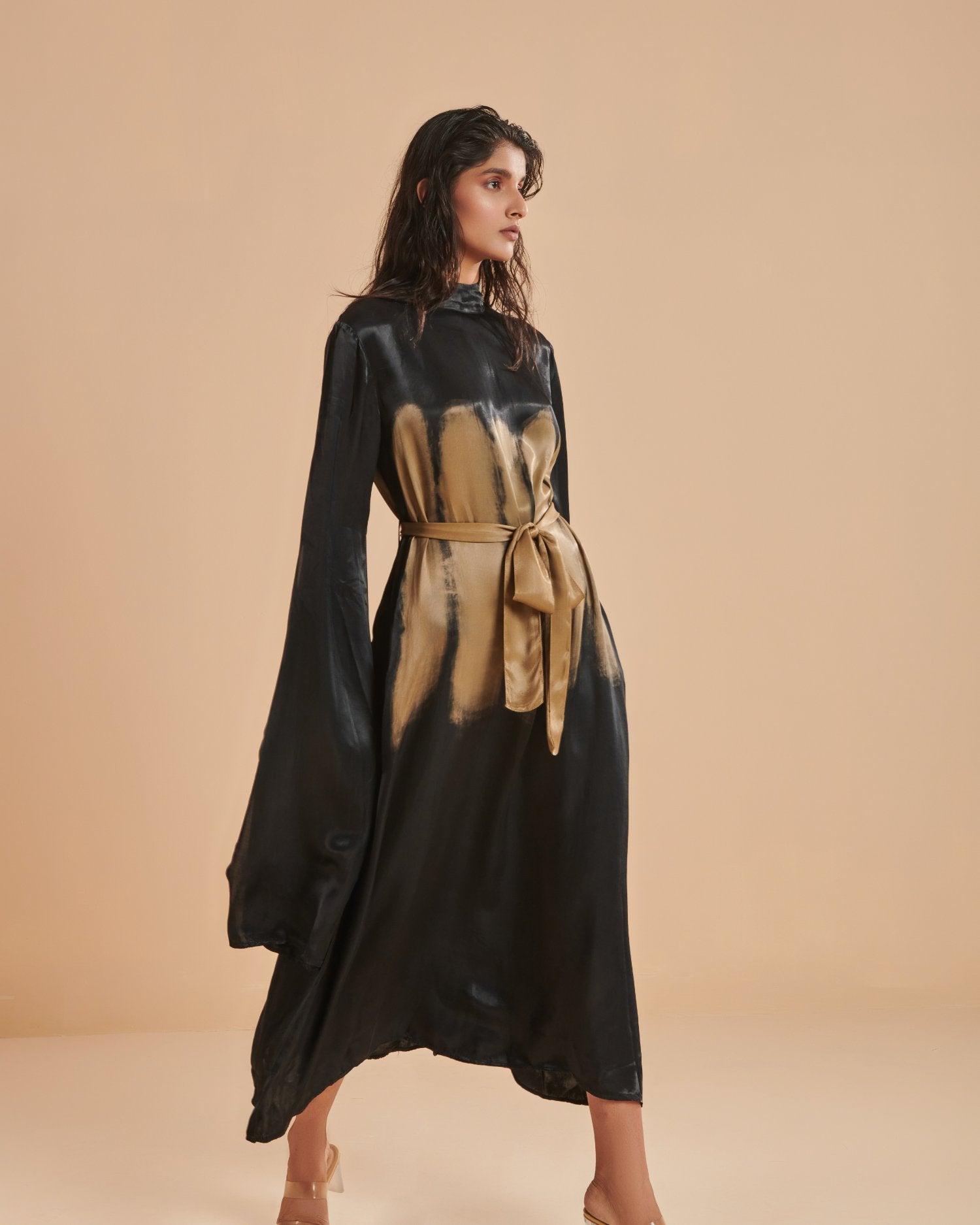 The flowy silhouette of azoro dress drapes gracefully with a center belt that creates a flattering waistline, complemented by contemporary extended sleeves, adding a touch of refinement to the ensemble.