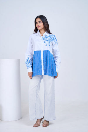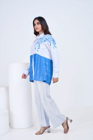 A crisp white collared shirt reimagined with a hand-painted blue floral cascade and dual textures. The upper panel features delicate botanical strokes in hues of sky and ink, while the bottom transitions into rich, woven chambray with a raw-fringe effect — mimicking the rhythmic flow of water. Finished with cuff detailing and an easy silhouette, this piece strikes the perfect balance between classic and contemporary.