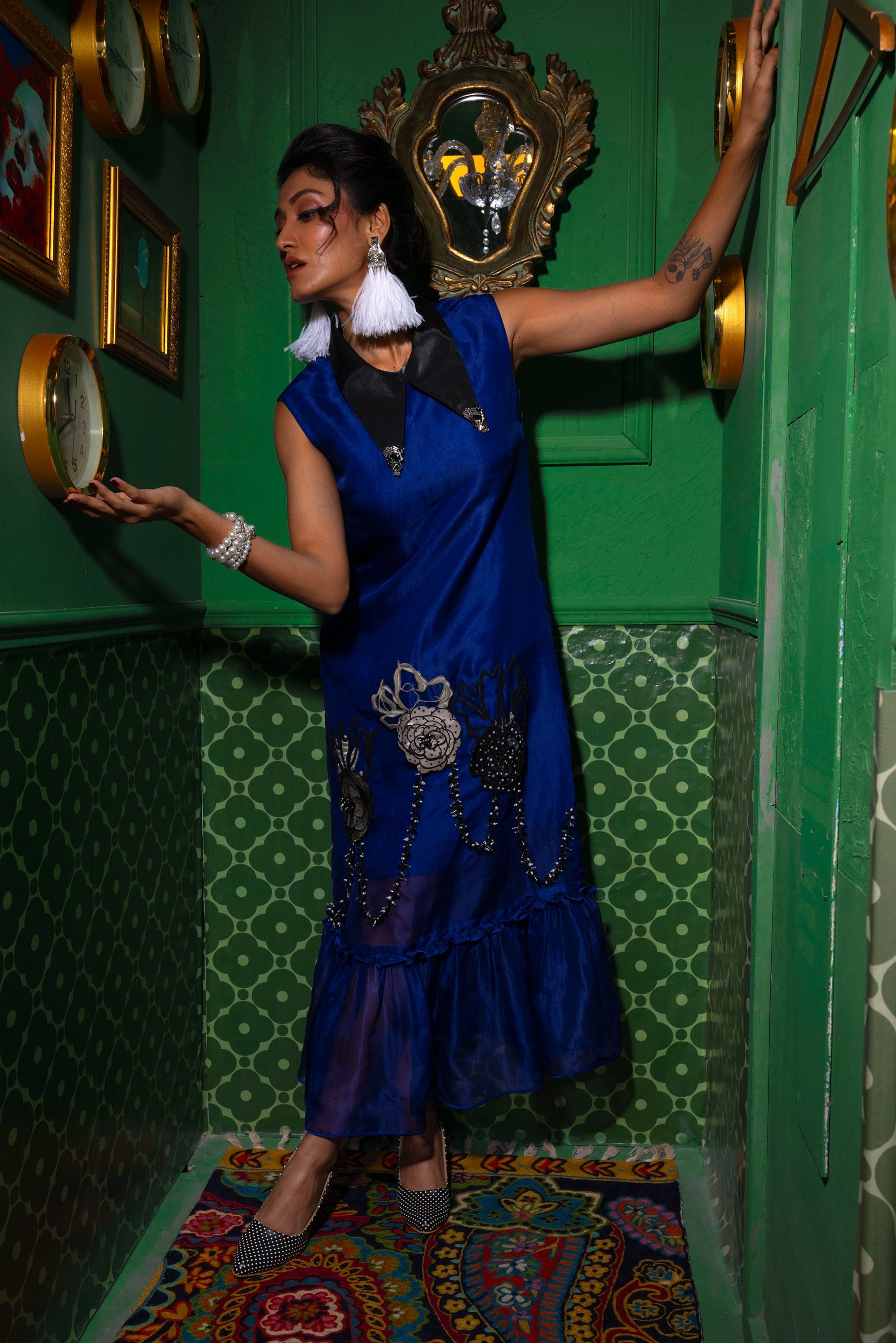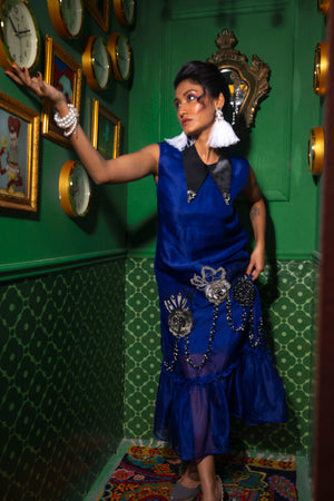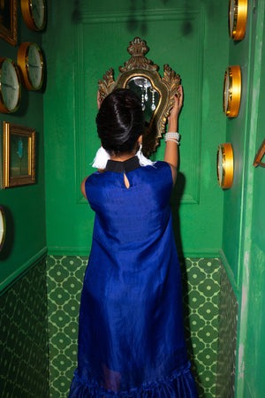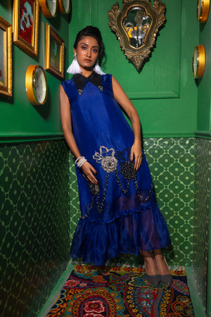 A cobalt-blue silk dress adorned with hand