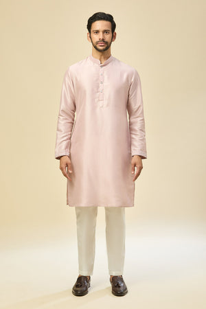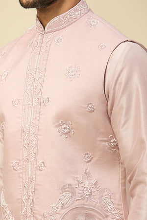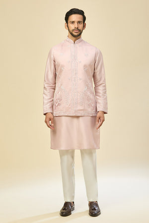 Baby pink muslin silk based jacket enhanced with pearl and cut dana embroidery, paired with a matching muslin silk based kurta enhanced with pearl and cut dana embroidery on the hem and an off white dupion silk based pants.