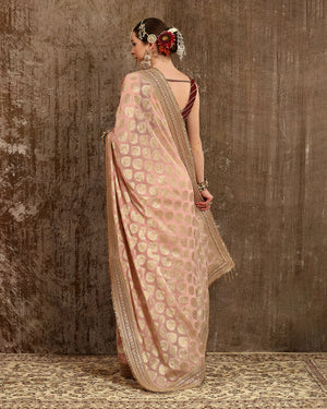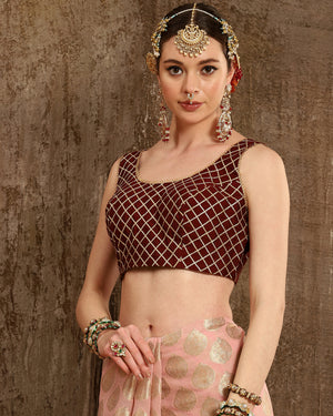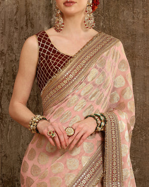 This is a beautiful Salmon Pink Georgette butta saree with exquisite detailing of Dori, Badla and Kasab work. This saree is paired with a Maroon Silk Chanderi blouse with Gota work, Hyderabadi pearl and crystal drop detailing. This blouse beautifully complements the saree providing the outfit a classic look!