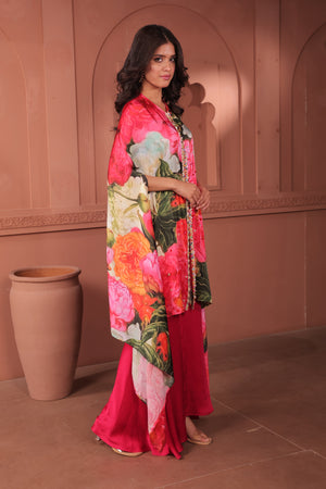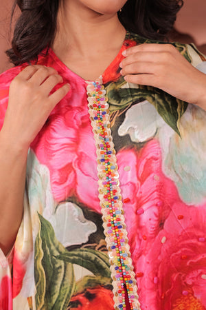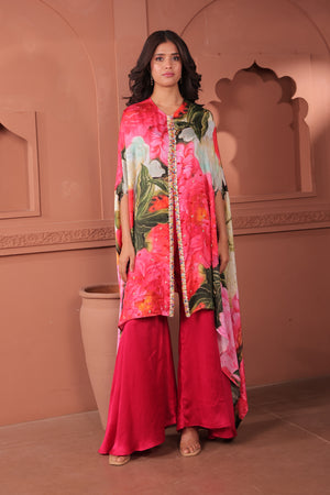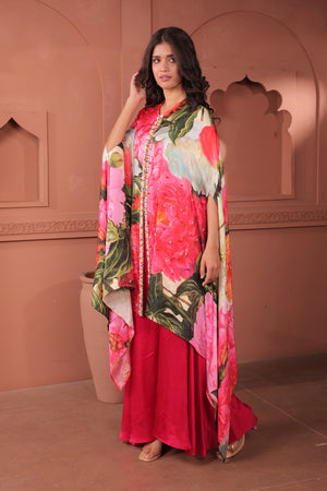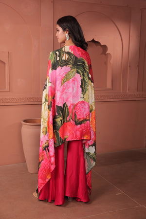 The Bageecha Asymmetric cape Set features a vibrant, all-over floral print