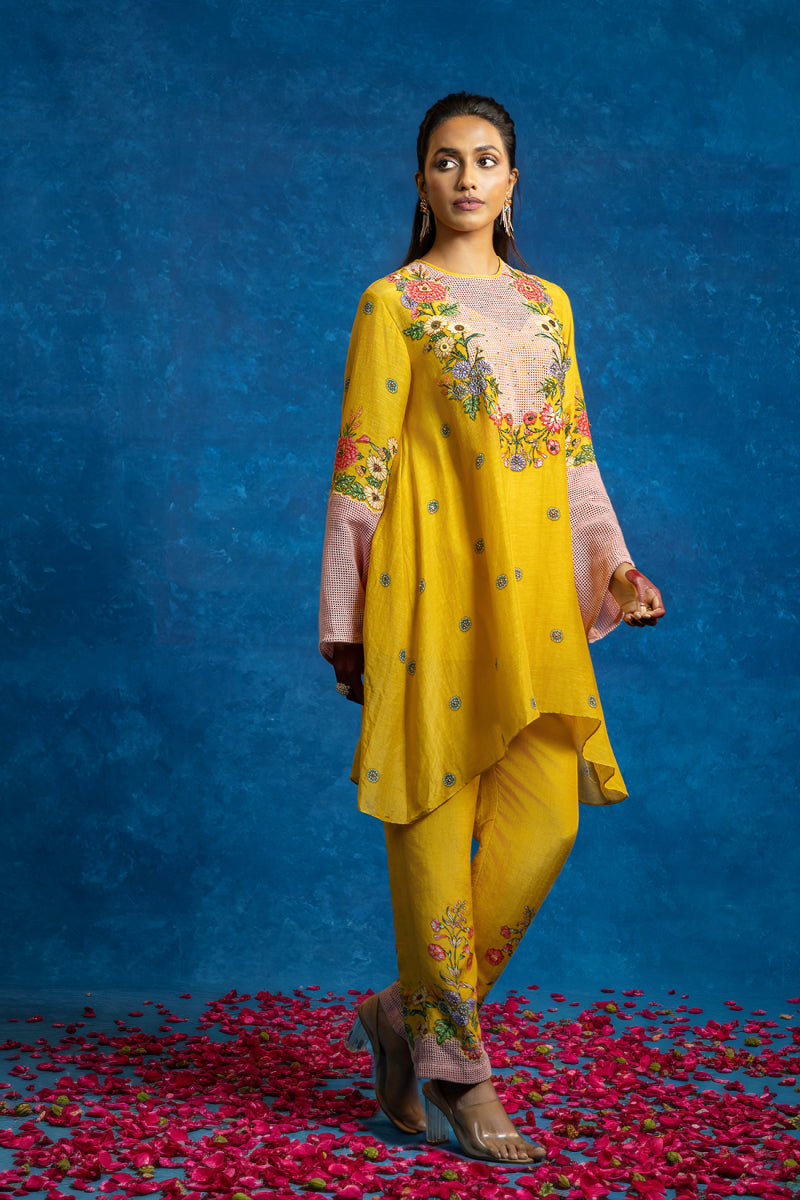 Yellow Rangtara colour-blocked kurta with appliqué detail, paired with printed linen pants.