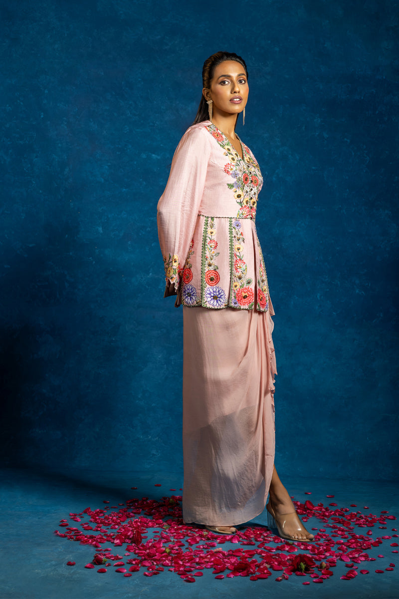 Yellow Rangtara embellished panneled peplum top in silk, paired with solid color drape skirt in organza.