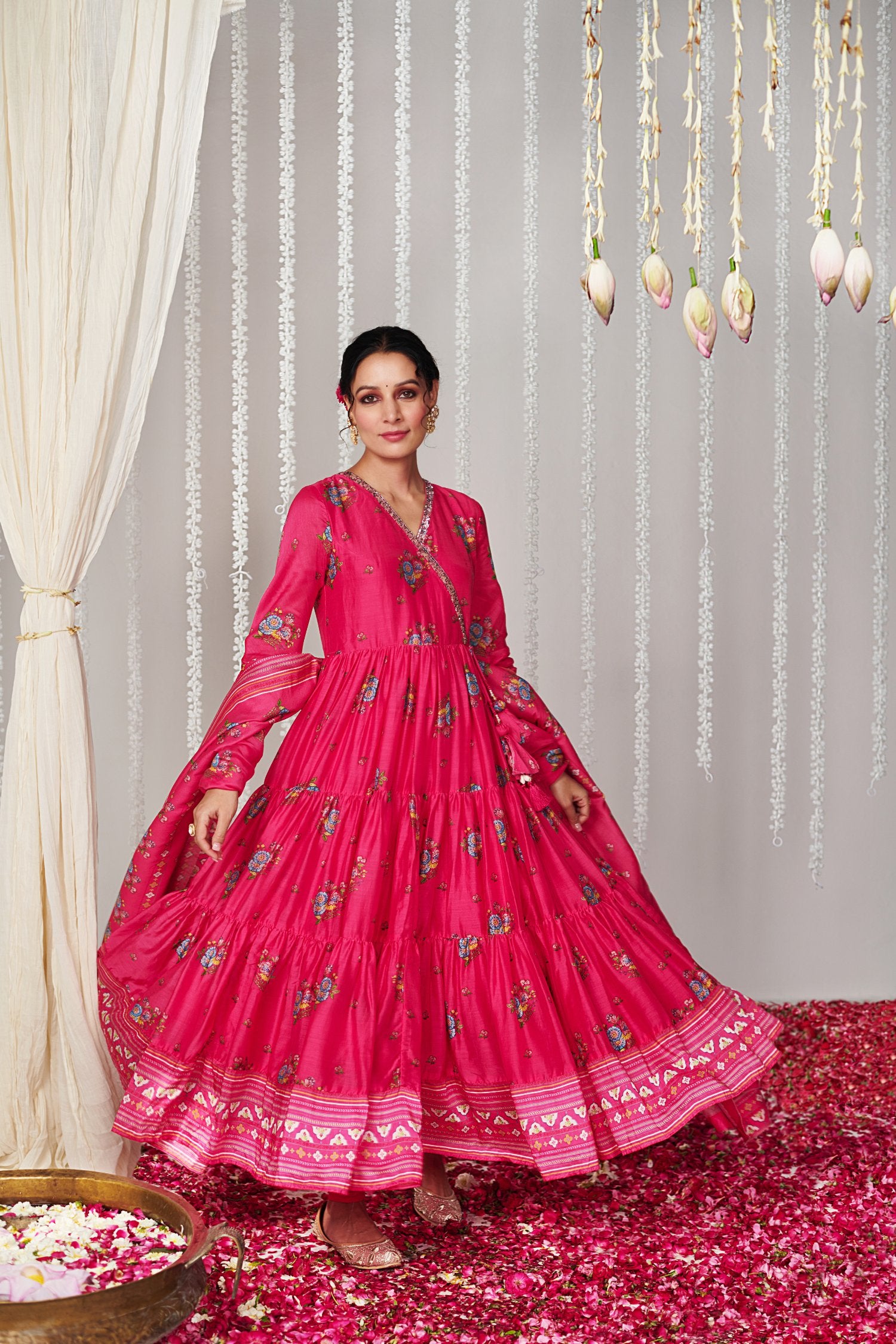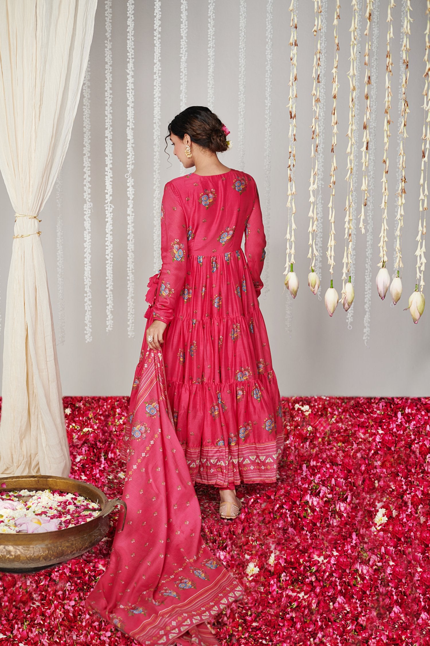 Hot pink printed Angrakha Anarkali in cotton silk fabric with embroidered neckline and cotton silk printed dupatta with mulmul lining