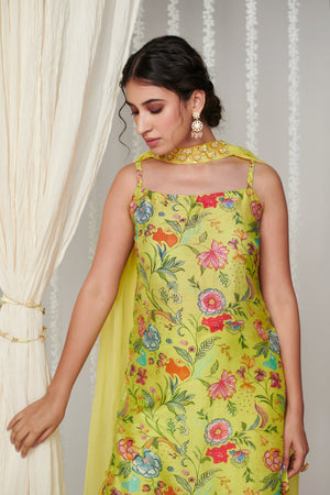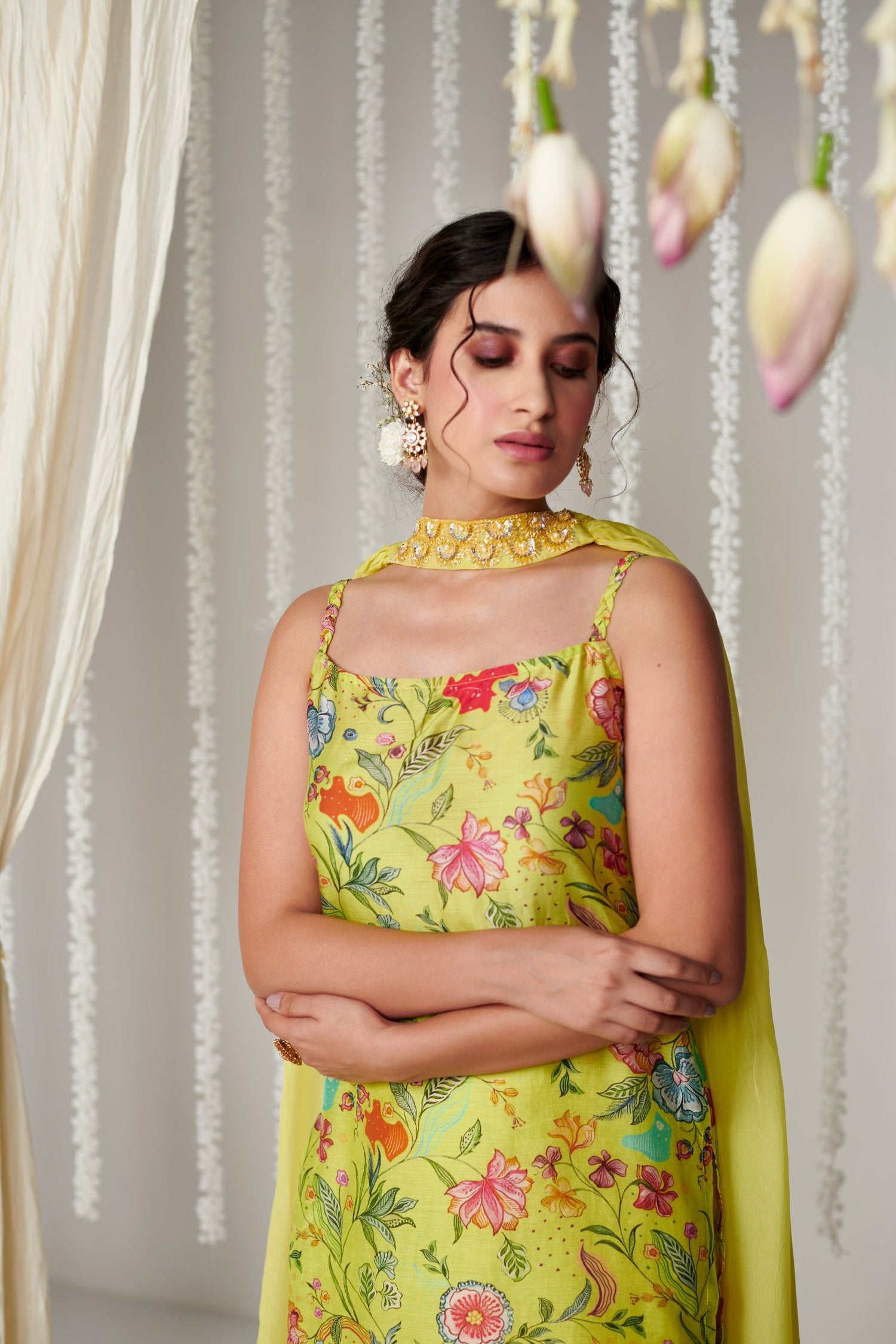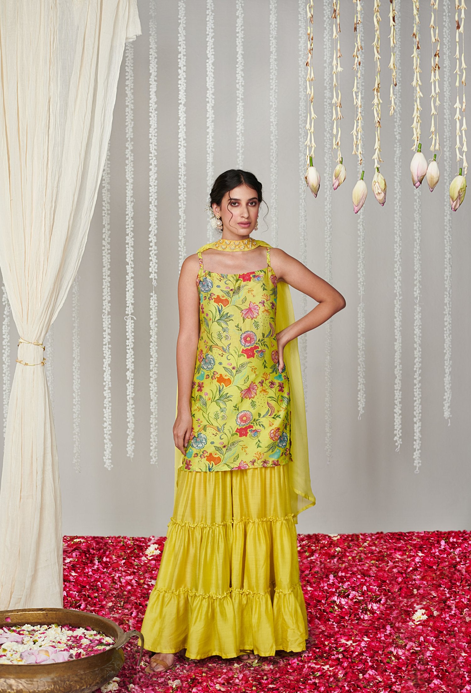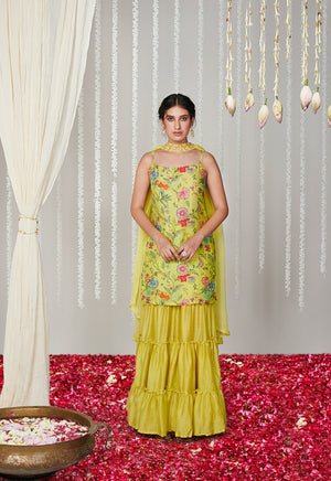 Neon sharara set with printed kurti in cotton silk fabric and solid tier sharara with embroidered chokar dupptta