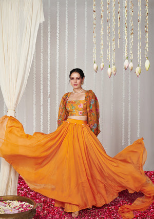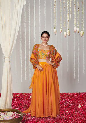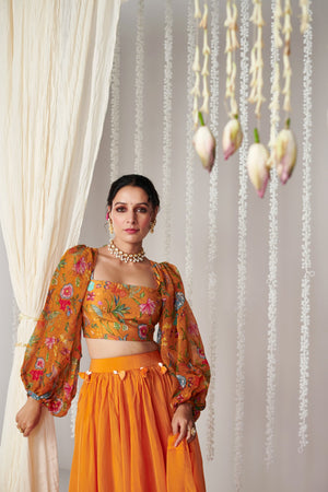 Orange Lehenga set with solid skirt in silk organza and print blouse in cotton silk with printed balloon sleeves in silk organza fabric and drape organza dupatta With mulmul lining shell and silk trim