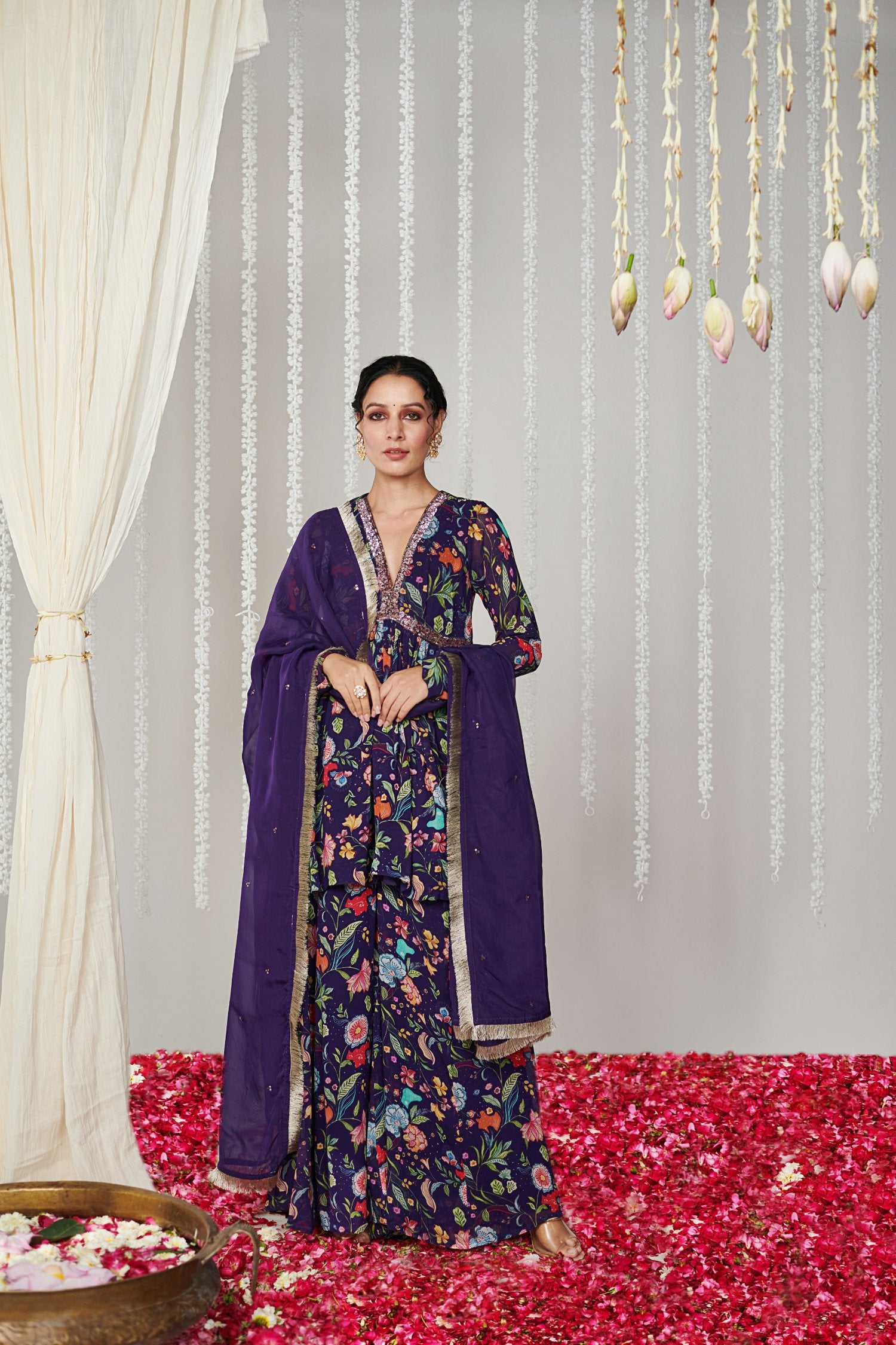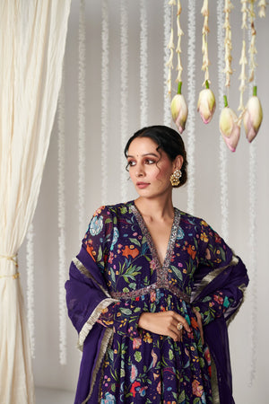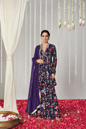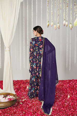 Purple floral printed sharara set in georgette fabric with embroidered neckline and silk organza dupatta with sequin embroidery and lace details with mulmul lining