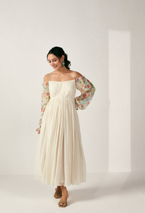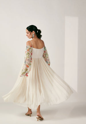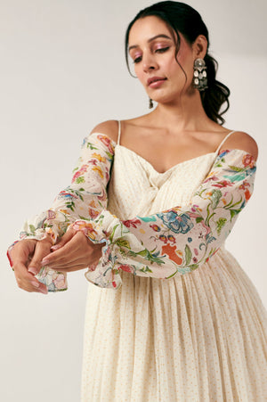 White polka printed dress with ballon sleeves in georgette fabric with mulmul lining Dress length: 48 inches