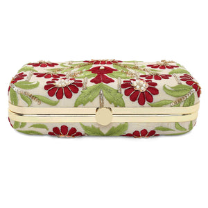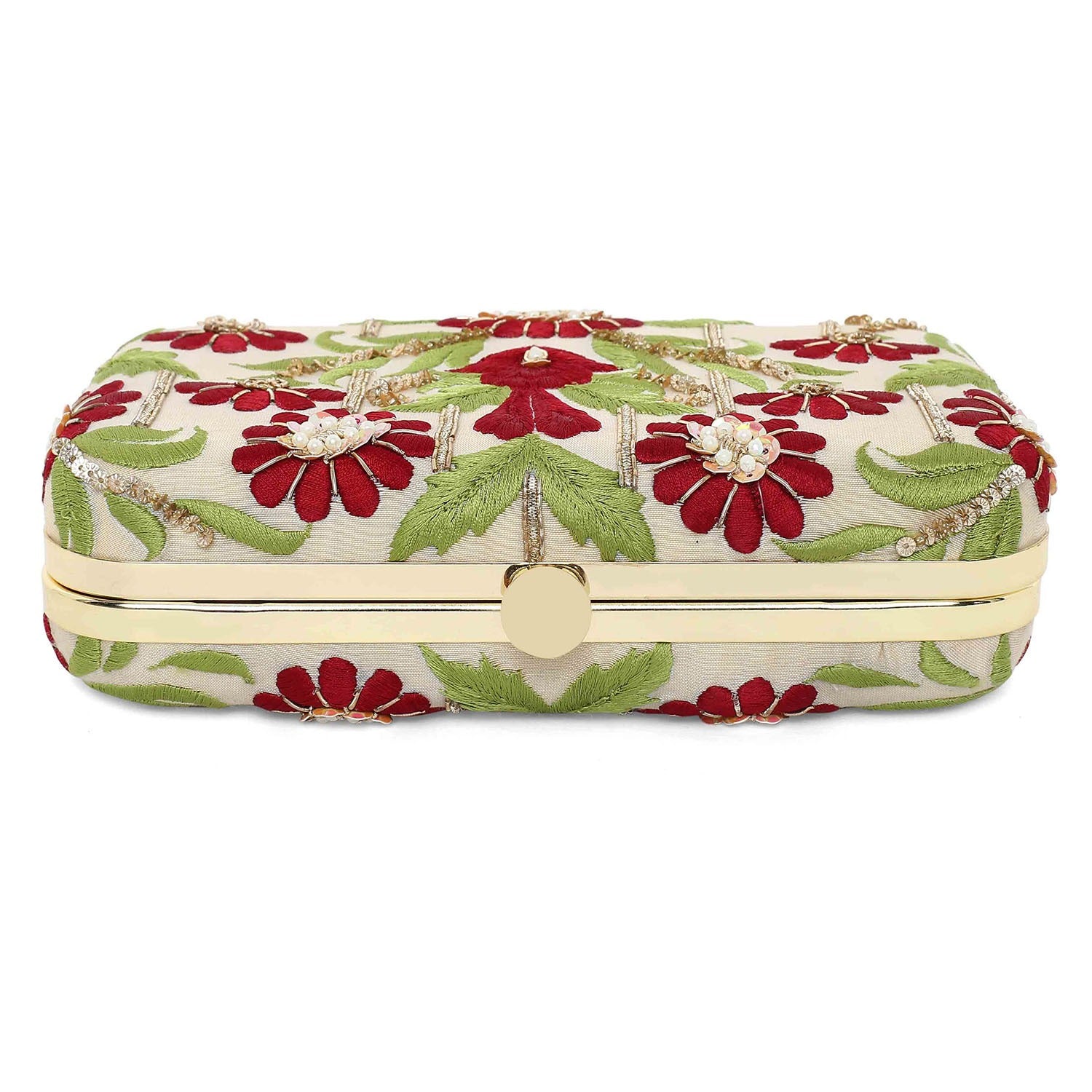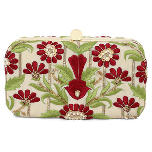 With scintillating design and hand embroidery this clutch bag comes with a detachable sling chain. Carry it with the chain or simply clutch it.