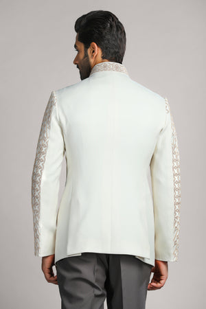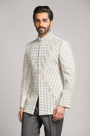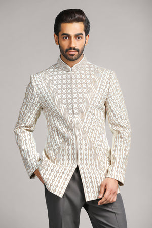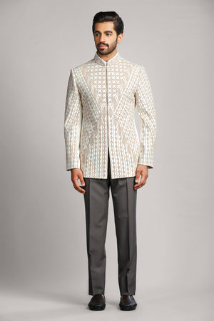 Presenting the Ivory Geometry Bandhgala, crafted in a refined ivory beige hue. This exceptional piece is adorned with intricate dori and cut dana embroidery, flowing seamlessly in a symmetrical, mathematical pattern across the entire bandhgala. The precise detailing enhances its classic charm, creating a luxurious and distinguished look for formal occasions. A true statement piece that blends tradition with sophistication, ensuring you stand out effortlessly.