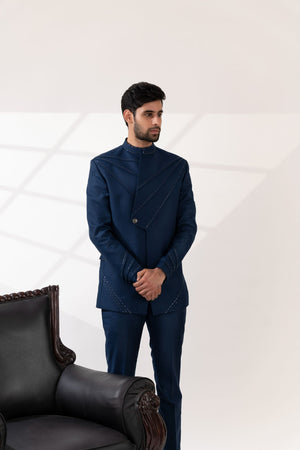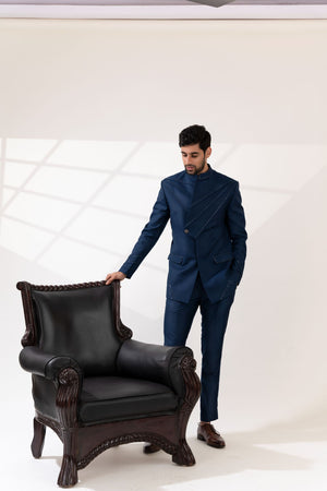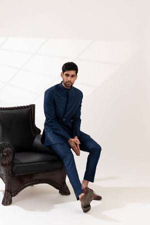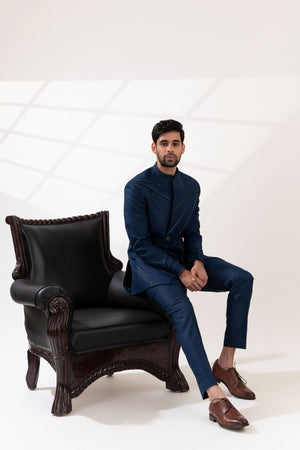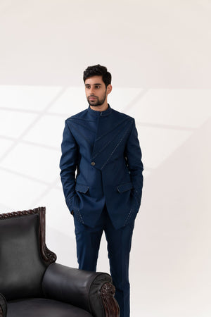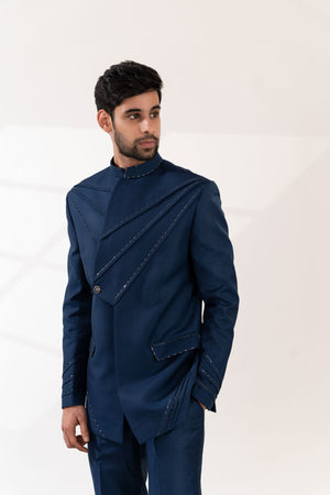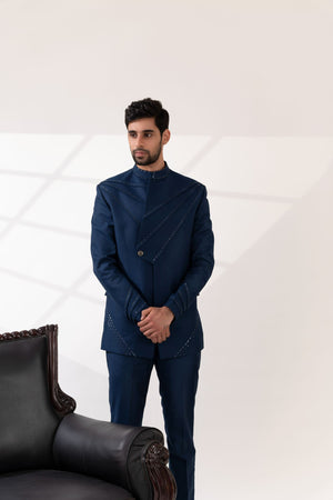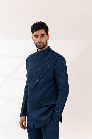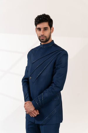 Navy Blue Cross Pintucks Bandhgala with Pants