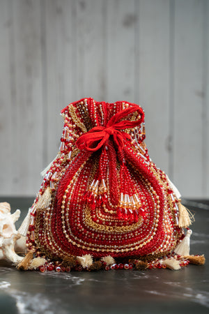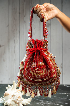 The Baraq Potli is a stunning blend of elegance and craftsmanship, featuring lustrous beads and intricate work in a maroon and gold palette. Finished with delicate tassels, it’s the perfect accessory for weddings, festive events, or evening soirées.