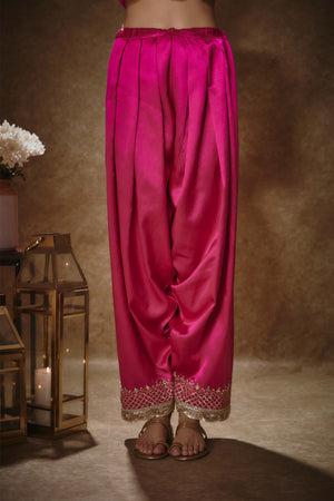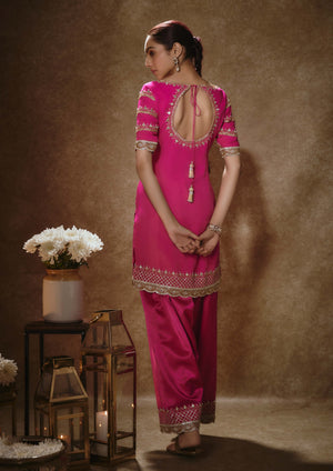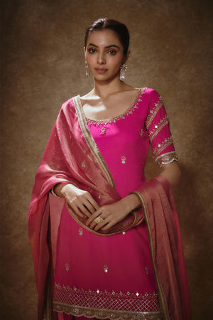 This set features a barbie pink georgette kurta salwar set, embroidered with mirrors, gota, sequins and pearls. The kurta has an embroidered neckline, hem and sleeves with small buttis. Teamed with a salwar with matching embroidery at hem. A shimmer tissue dupatta with tassel border completes the look.