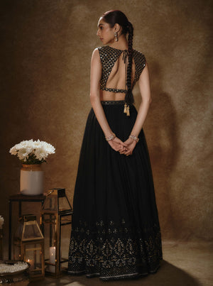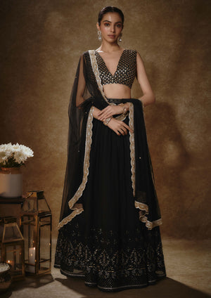 This look features a black & gold lehenga set, embroidered in thread, dori and sequins. It is teamed with a sleeveless blouse of matching scallop pattern embroidery. A matching net dupatta with buttis and handcrafted cutdana & sequin border completes the look. Cancan & pockets are included