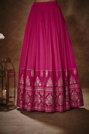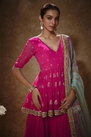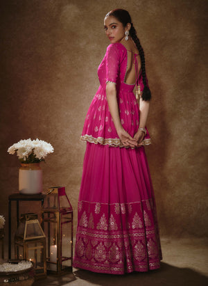 This look features a barbie pink gota lehenga set. The lehenga comprises of machine embroidered light gold gota, sequin and threadwork kalis. Teamed with a matching embroidered peplum kurta. The kurta has mirror, cutdana, pearl and sequin embroidery borders. A mint organza dupatta with a tassel border and badla buttis completes the look. Cancan & pockets are included.