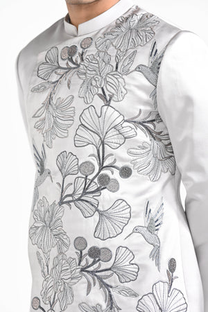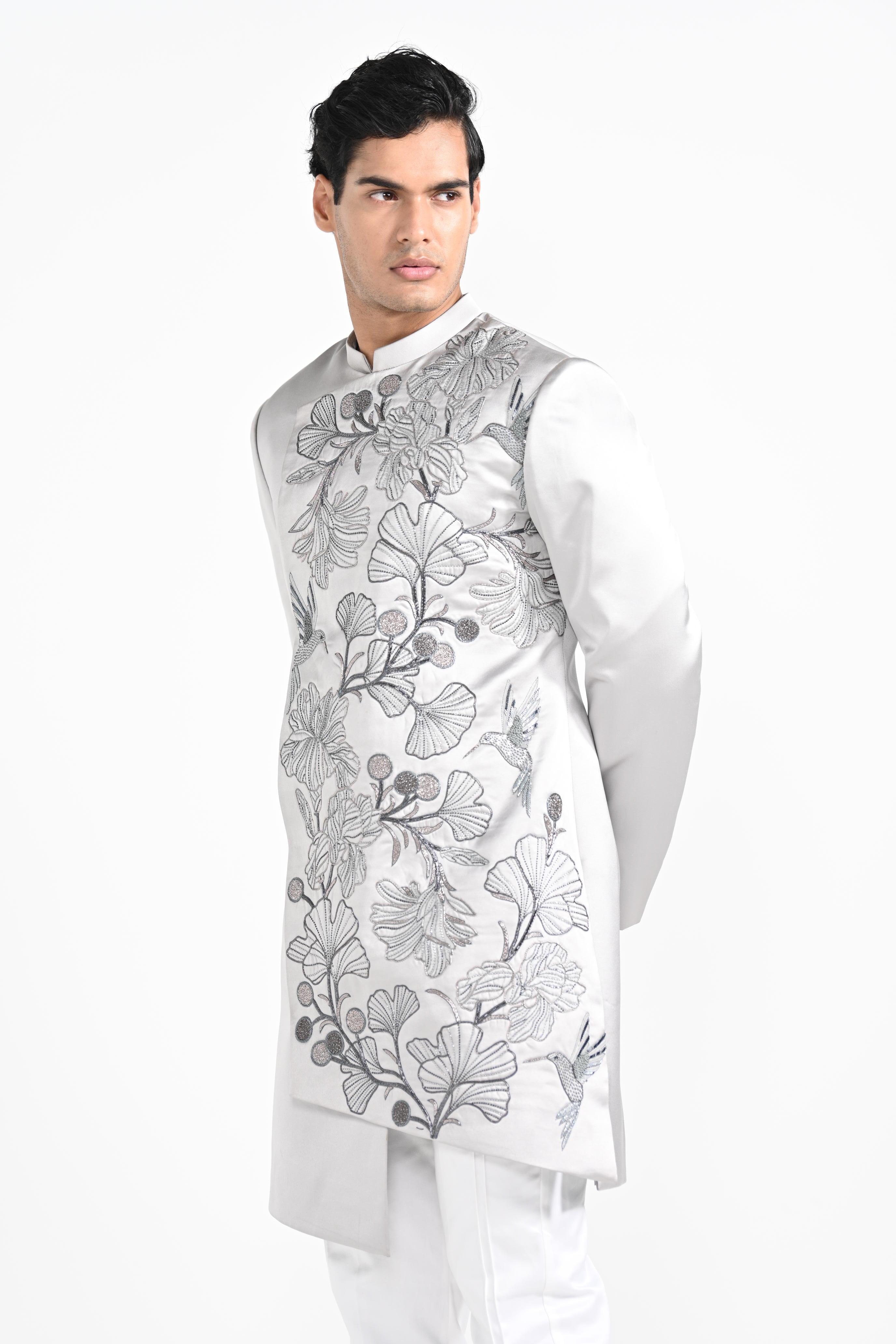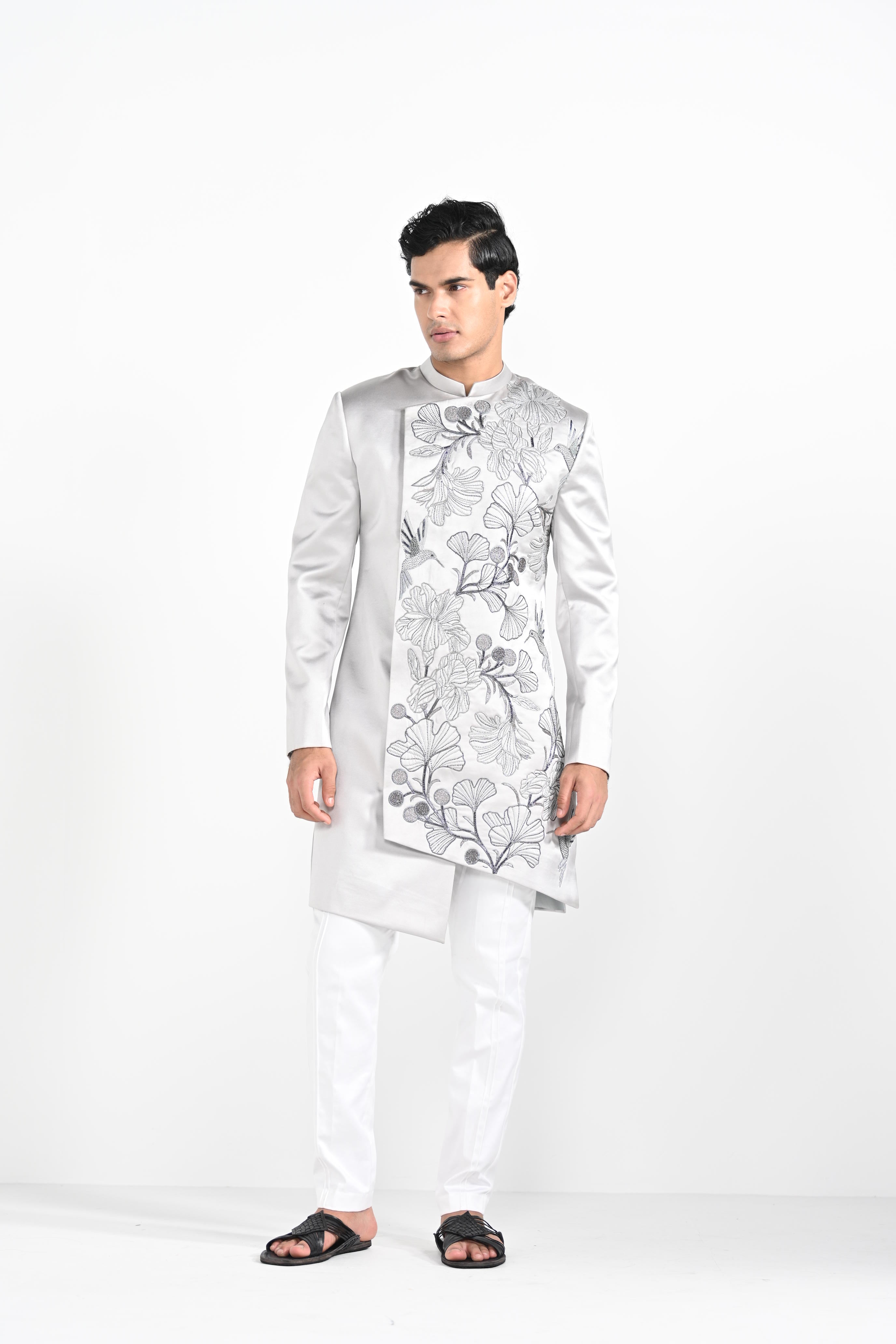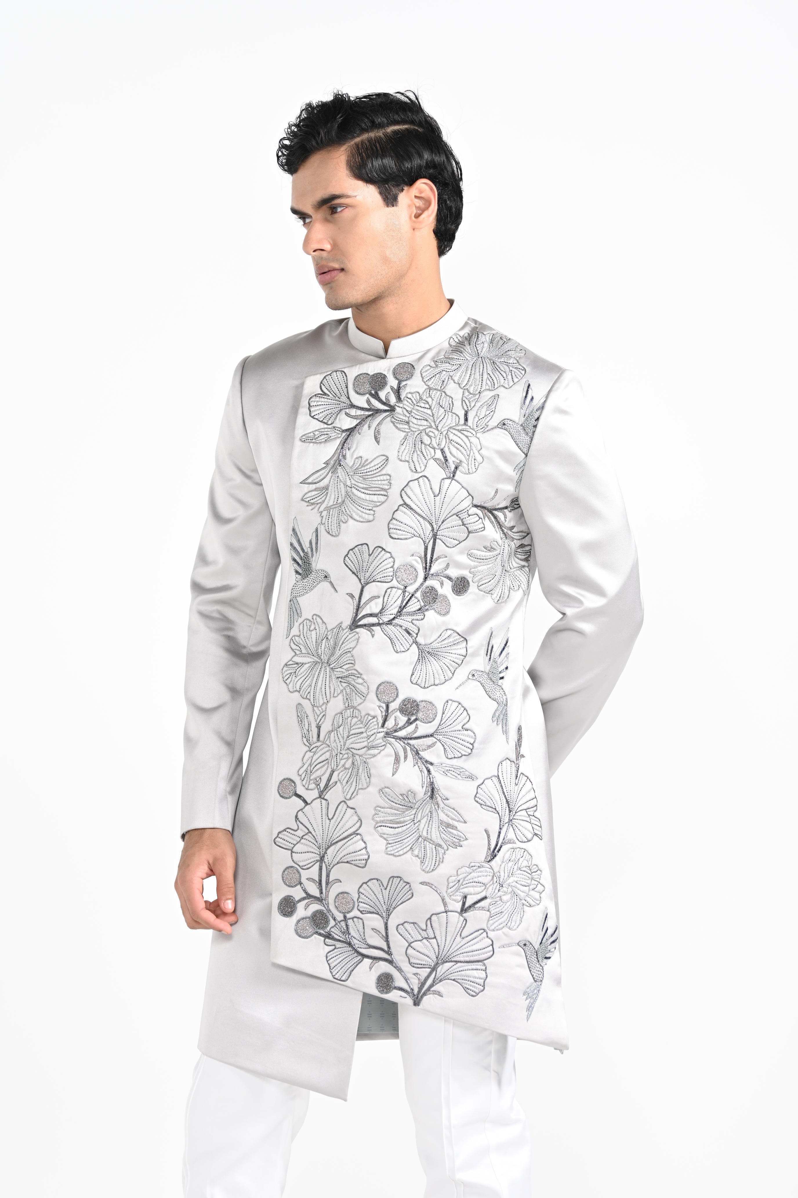 Barely Grey Coloured Overlapping Panel Achkan with embroidery highlight using materials and threads paired with same coloured trousers. Color of the actual garment may vary due to lighting conditions during the shoot .