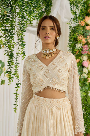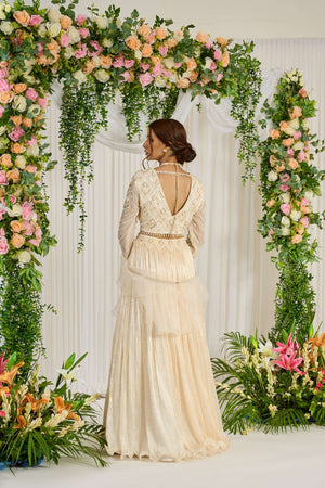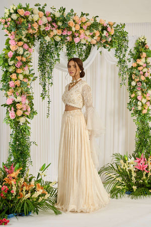 Gorgeous Ivory Lehenga In Crinkle Silk With Embroidery Details At The Waist Belt . It Is Paired With Fully Embellished Handcrafted Choli In Gorgette. Blouse Has A Flatering V Neckline ,Its Padded And Have Side Zip Closure. The Outfit Is Paired With Organza Ruffle Dupatta.