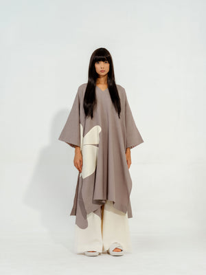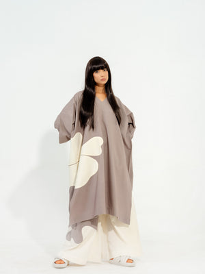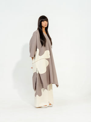 Elongated pants with appliqué hand sewn on one side, with elasticised waistband for ease of wearing.