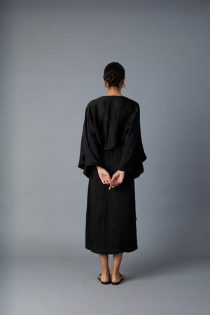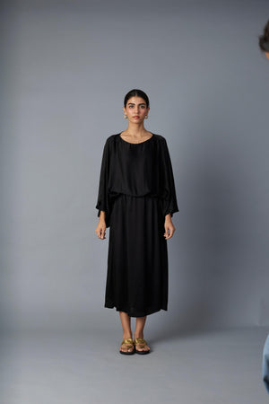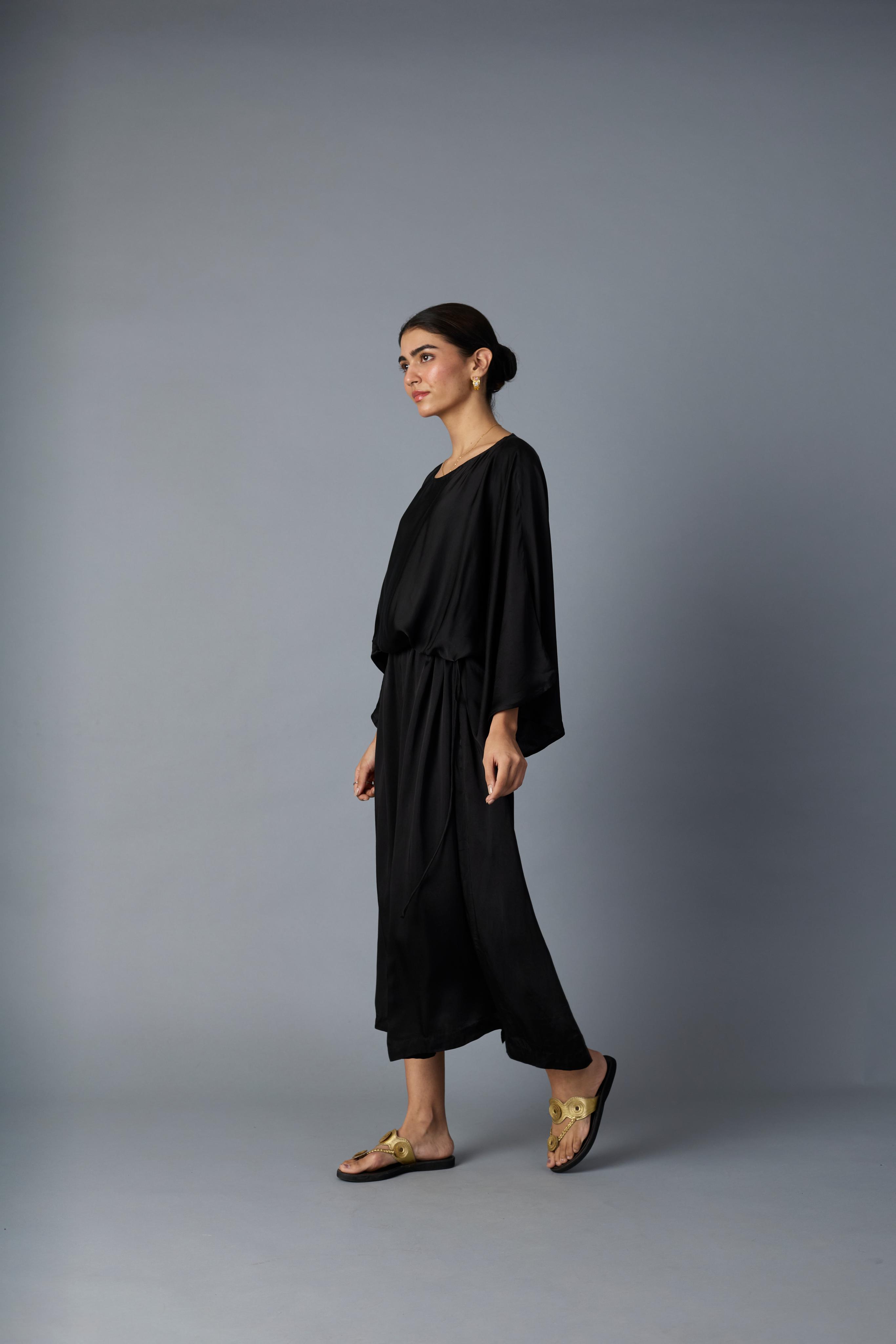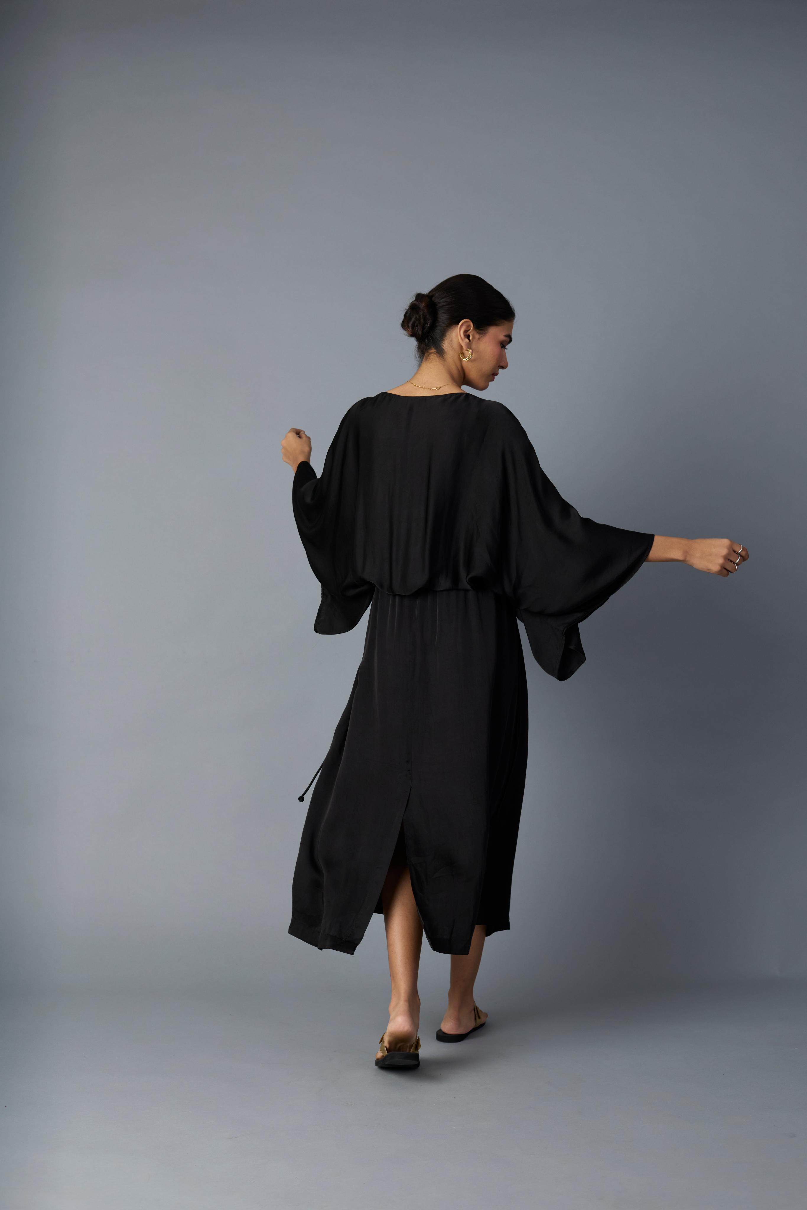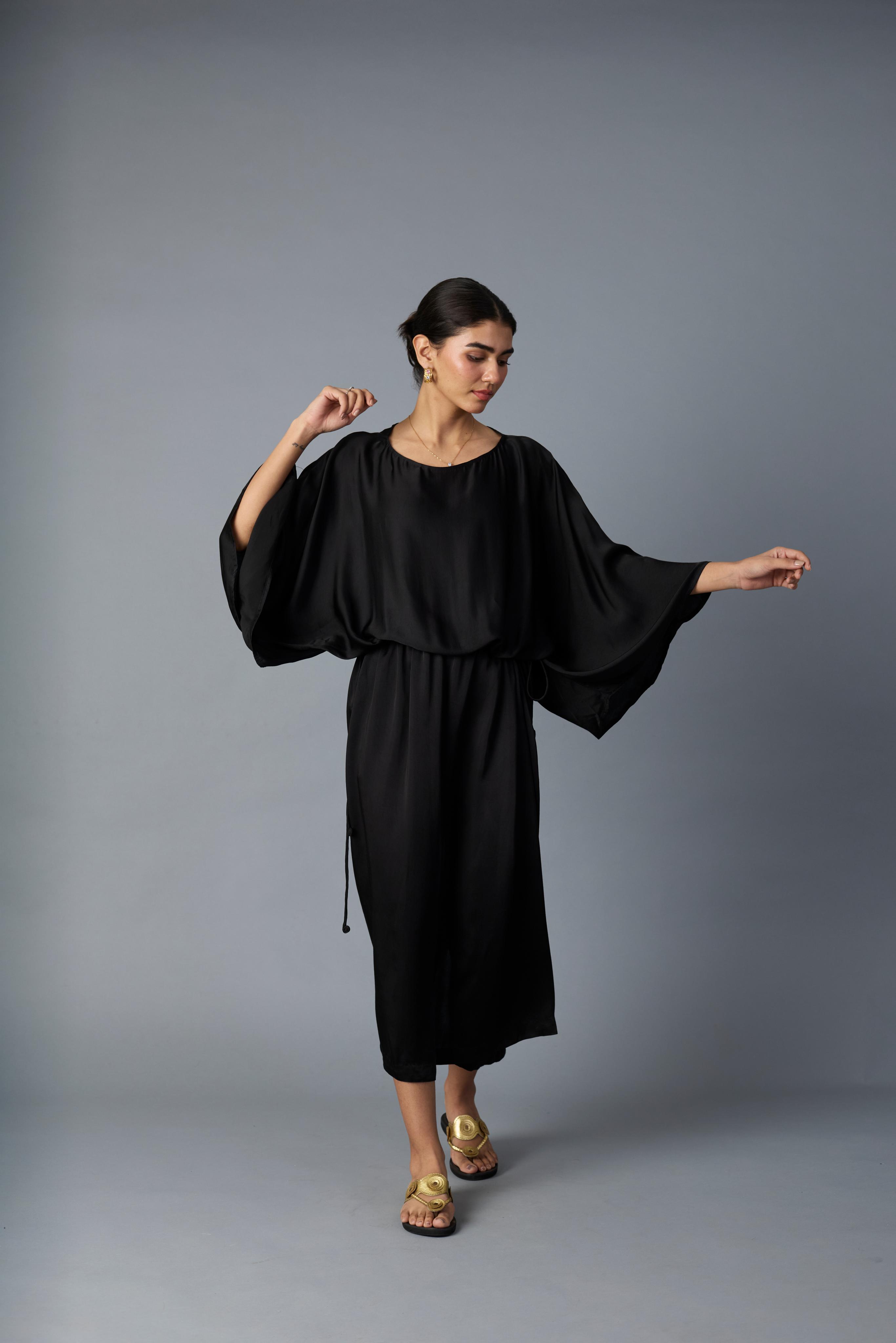 This versatile black dress crafted from smooth modal satin features elegant batwing sleeves and a drawstring waist, allowing you to adjust the fit for comfort and style. Its fluid silhouette works well for both daytime events and evening outings. Pair it with minimalist jewelry and strappy heels for a refined look, or layer with our chidiya or chamkila jacket. The breathable fabric and relaxed design make it a sophisticated yet practical choice for any wardrobe.