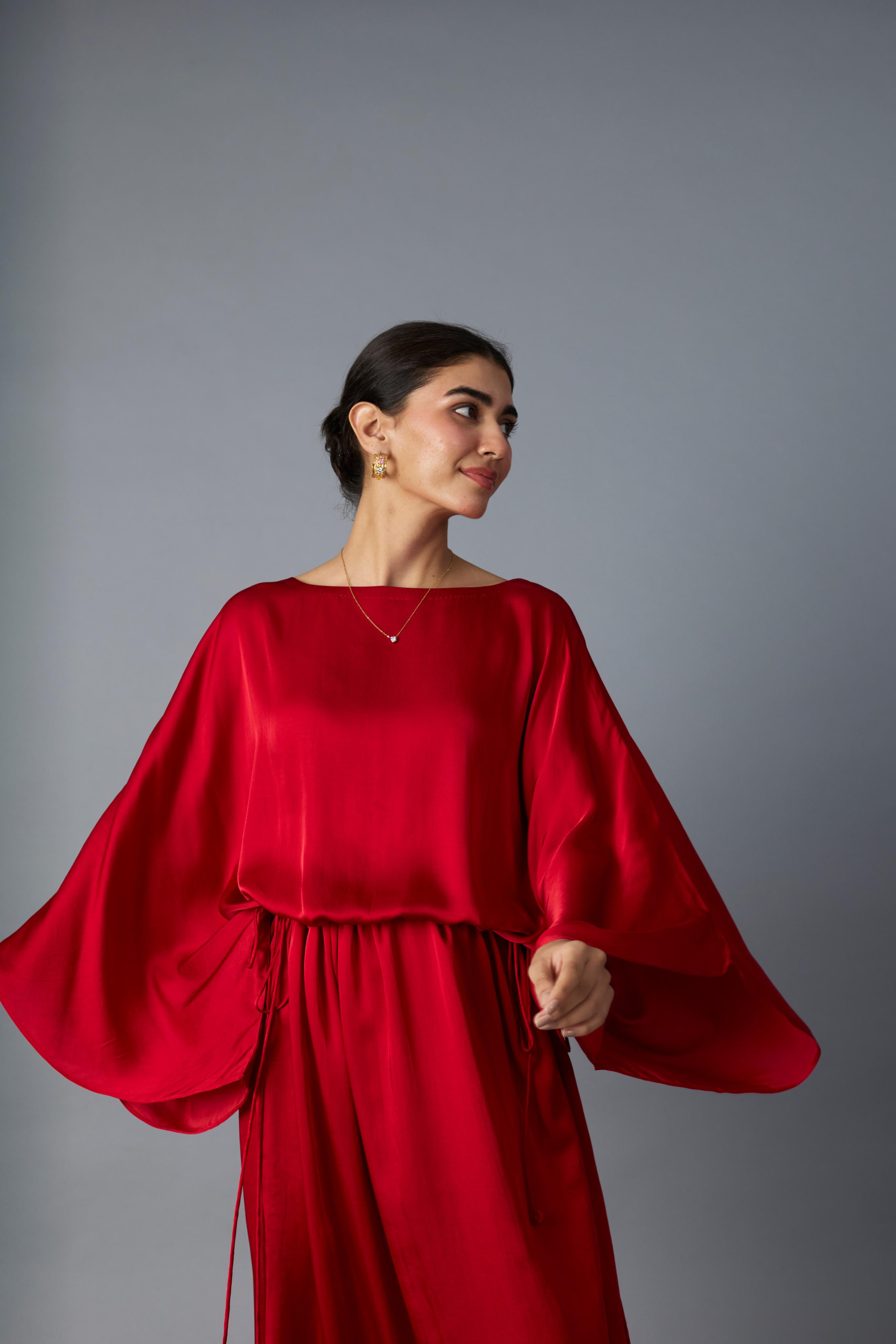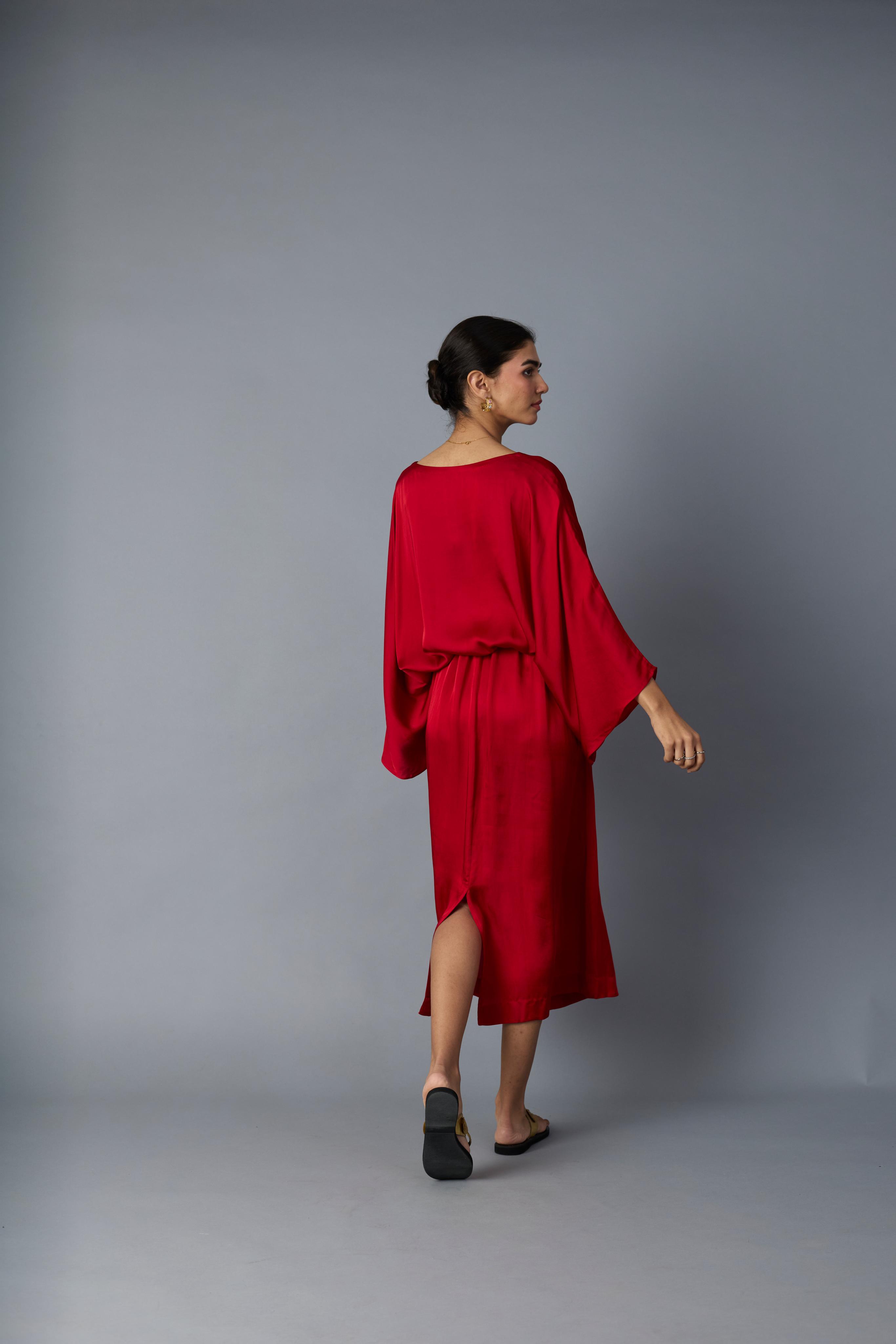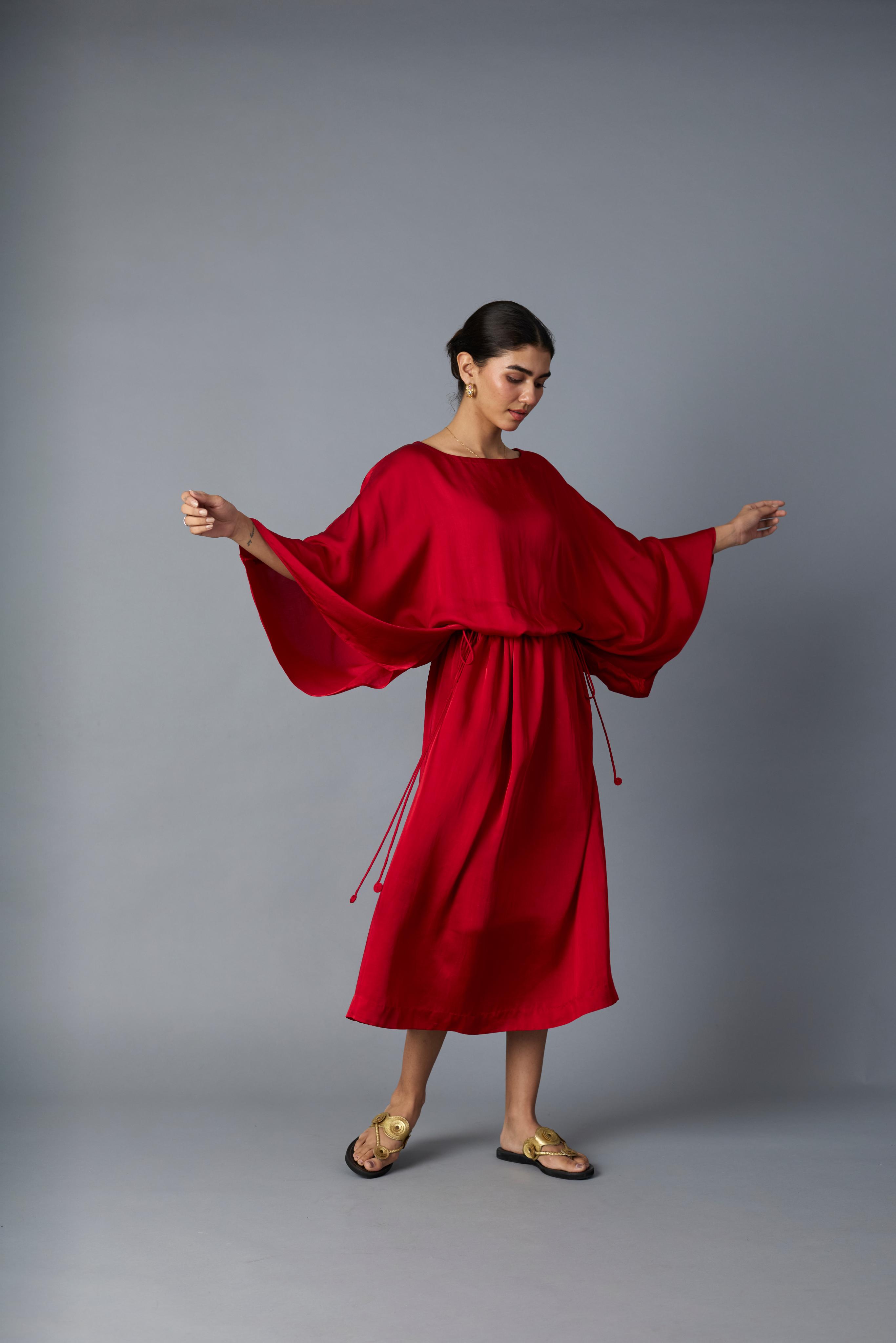 This versatile batwing dress crafted from smooth modal satin features elegant batwing sleeves and a drawstring waist, allowing you to adjust the fit for comfort and style. Its fluid silhouette works well for both daytime events and evening outings. Pair it with minimalist jewelry and strappy heels for a refined look, or layer with our chidiya or chamkila jacket. The breathable fabric and relaxed design make it a sophisticated yet practical choice for any wardrobe.