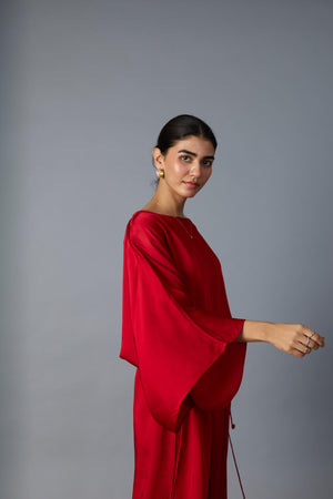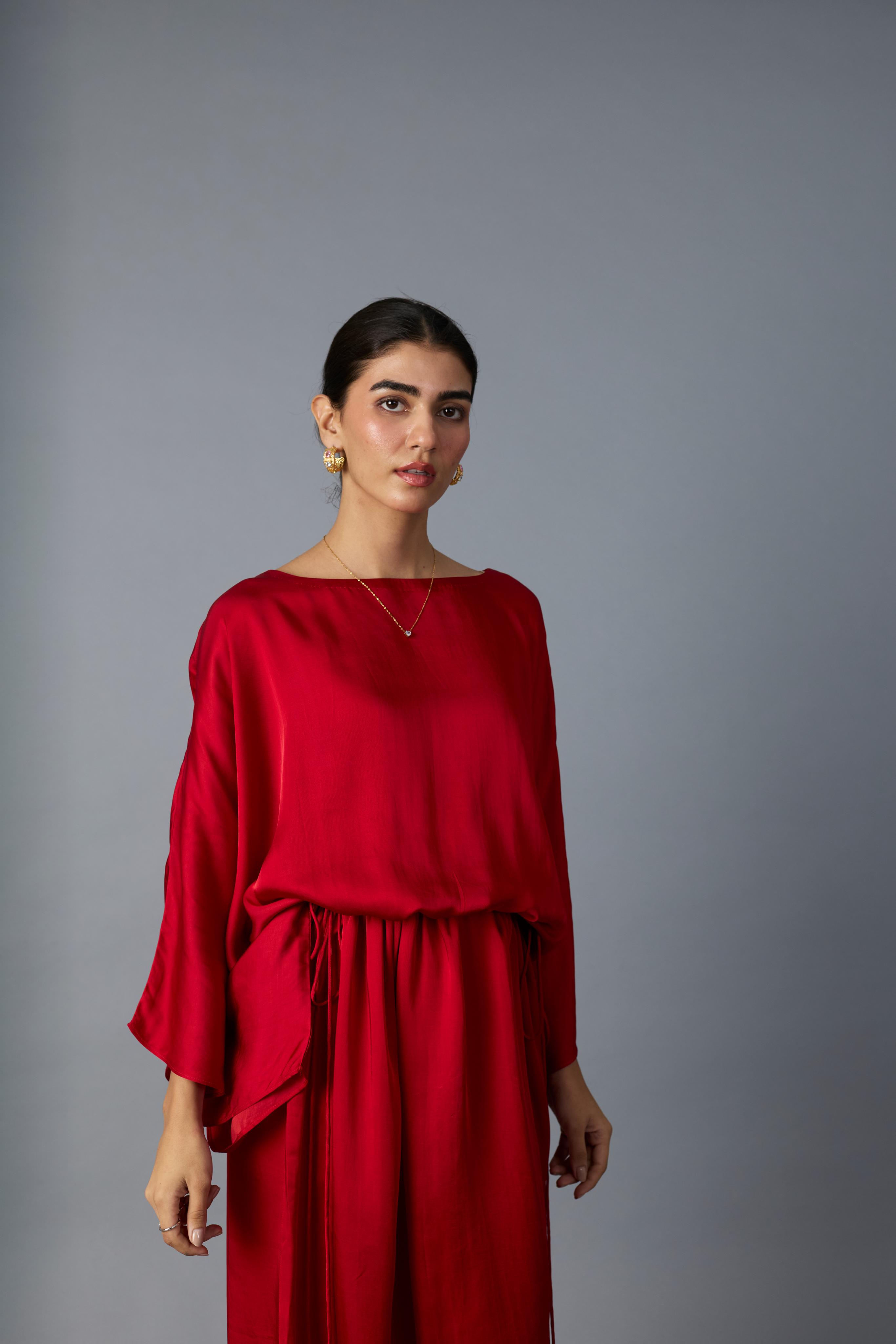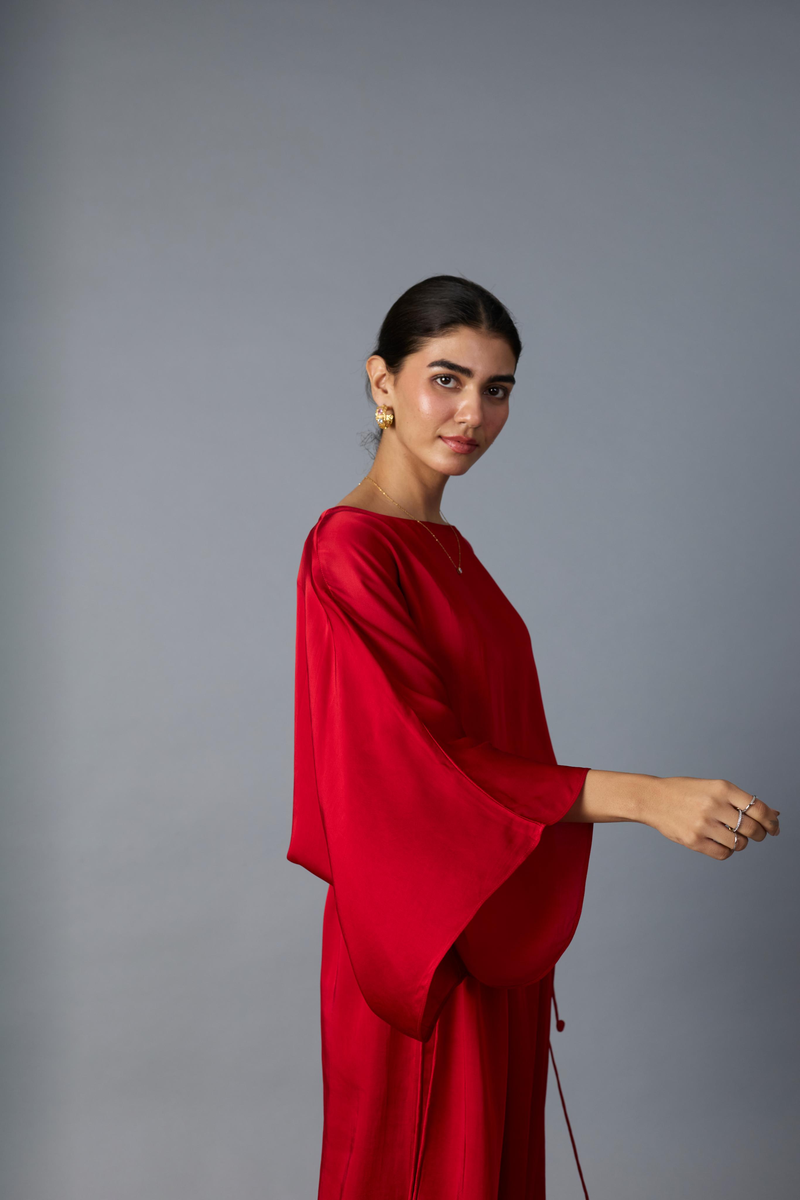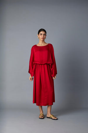 This versatile batwing dress crafted from smooth modal satin features elegant batwing sleeves and a drawstring waist, allowing you to adjust the fit for comfort and style. Its fluid silhouette works well for both daytime events and evening outings. Pair it with minimalist jewelry and strappy heels for a refined look, or layer with our chidiya or chamkila jacket. The breathable fabric and relaxed design make it a sophisticated yet practical choice for any wardrobe.