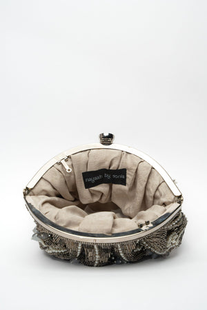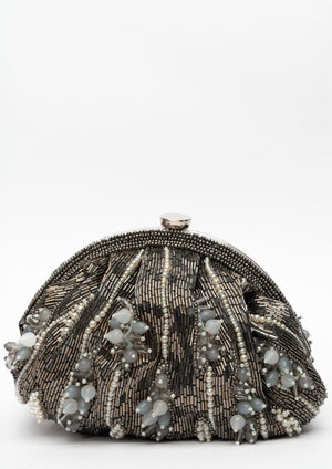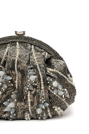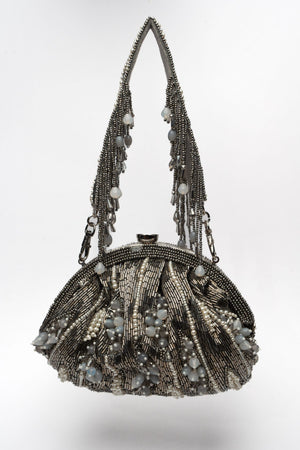 A chic yet stand out piece dressed with beads in shades of silver and grey that come together with a beaded studded frame finish and a beaded tassel handle.