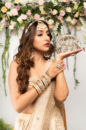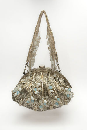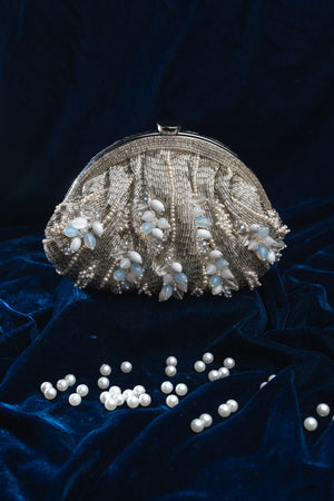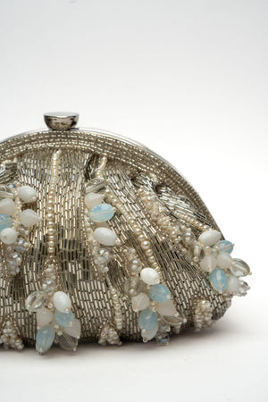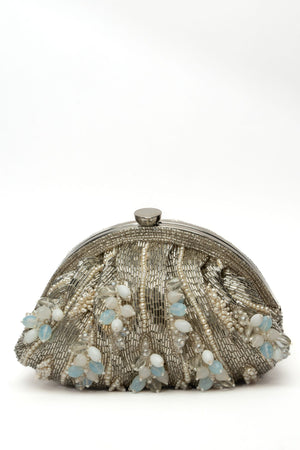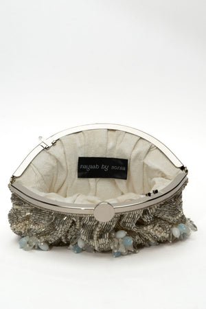 A chic yet stand out piece dressed with beads in shades of silver and grey that come together with a beaded studded frame finish and a beaded tassel handle.