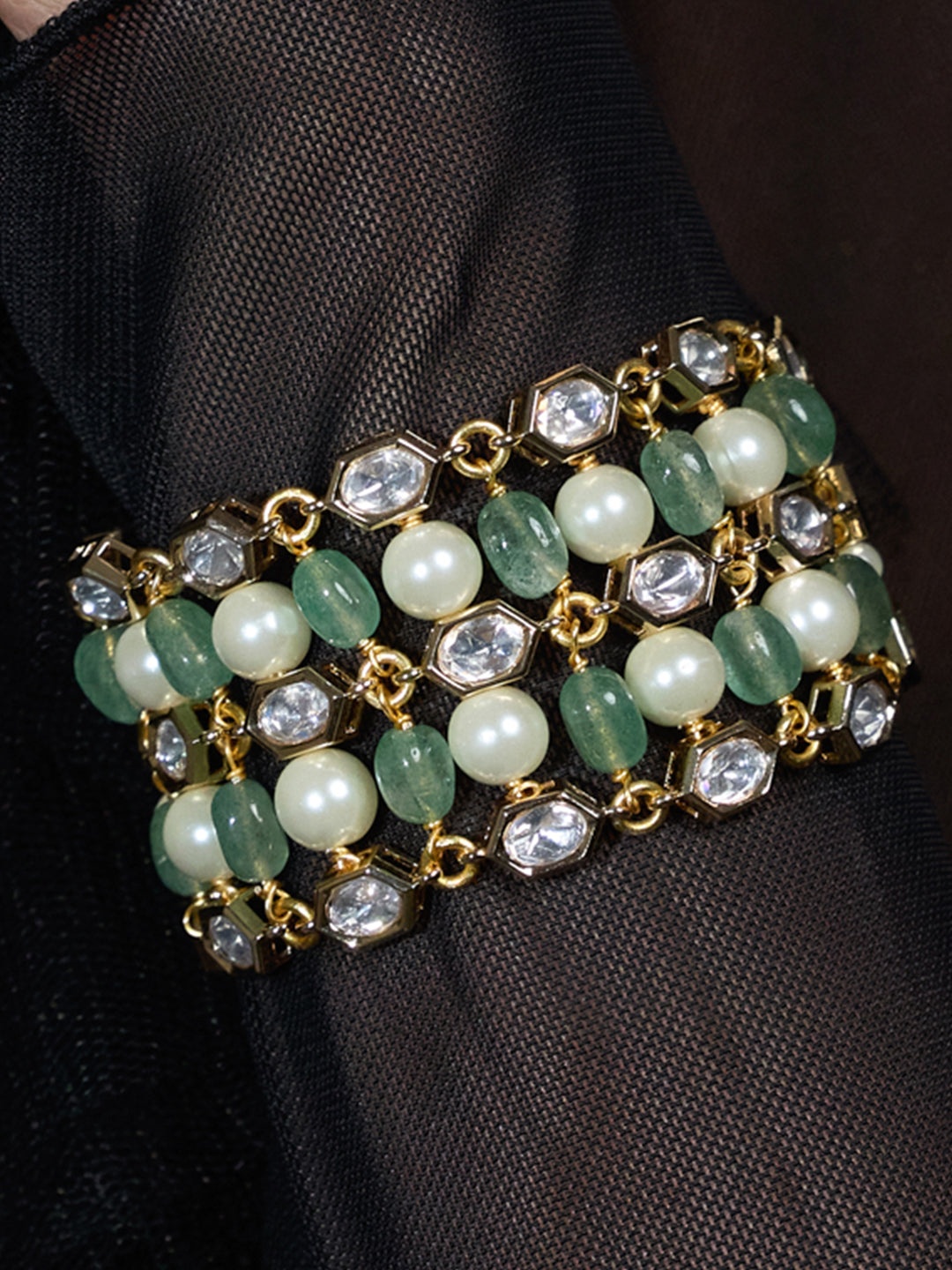 A graceful fusion of pastel green, white, and gold-pleted beads, this handcrafted cuff bracelet offers a balanced, elegant look — ideal for ethnic wear or classy everyday styling.