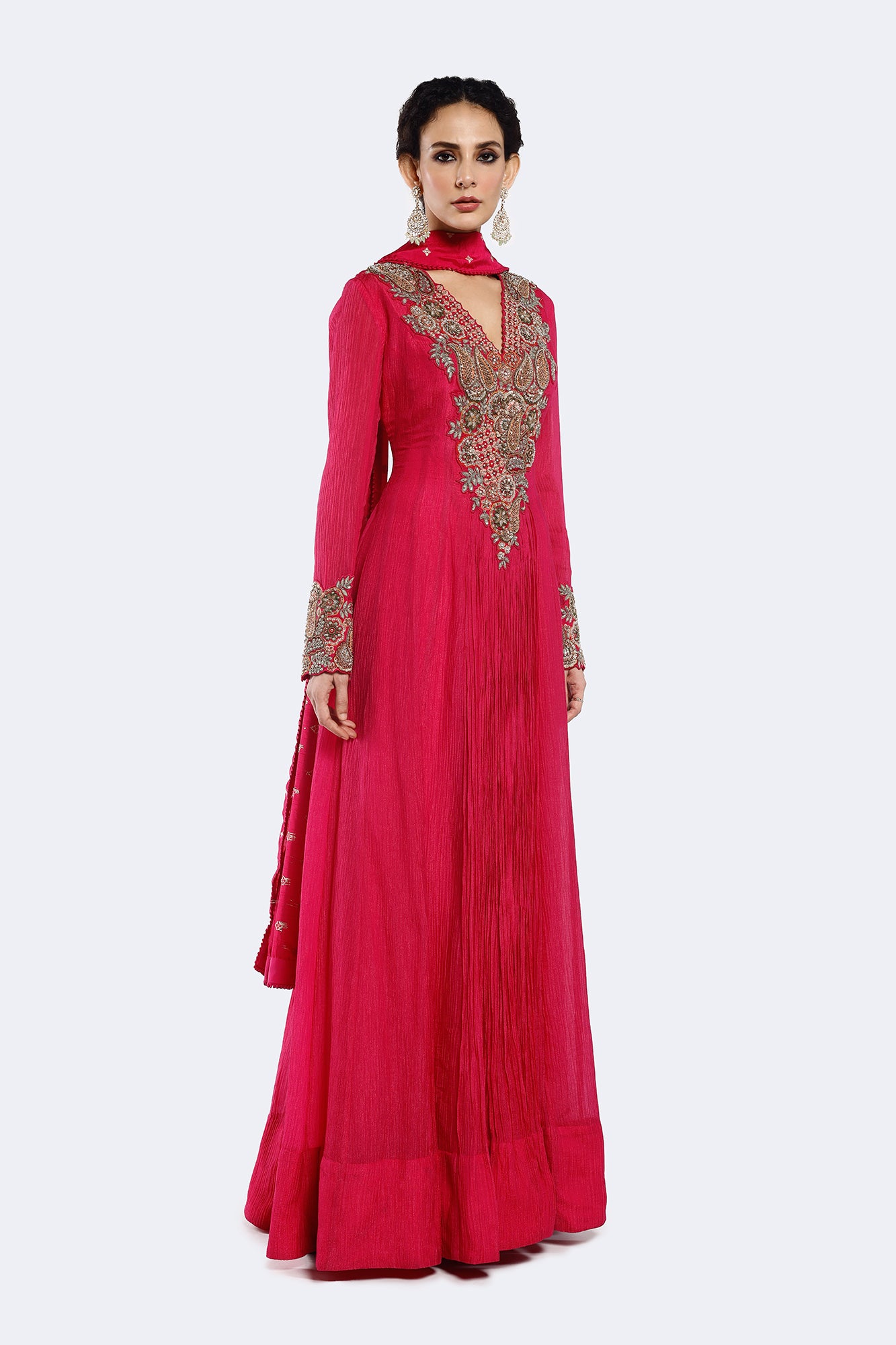 Crush fabric Anarkali suit set bedecked with embellished paisley motifs on the decolletage and cuff edges. Set features an embellished full sleeve Anarkali suit, pant and a minimally embellished dupatta. Embellishments include multicolour thread work, dabka, cheed, pearl and sequins.