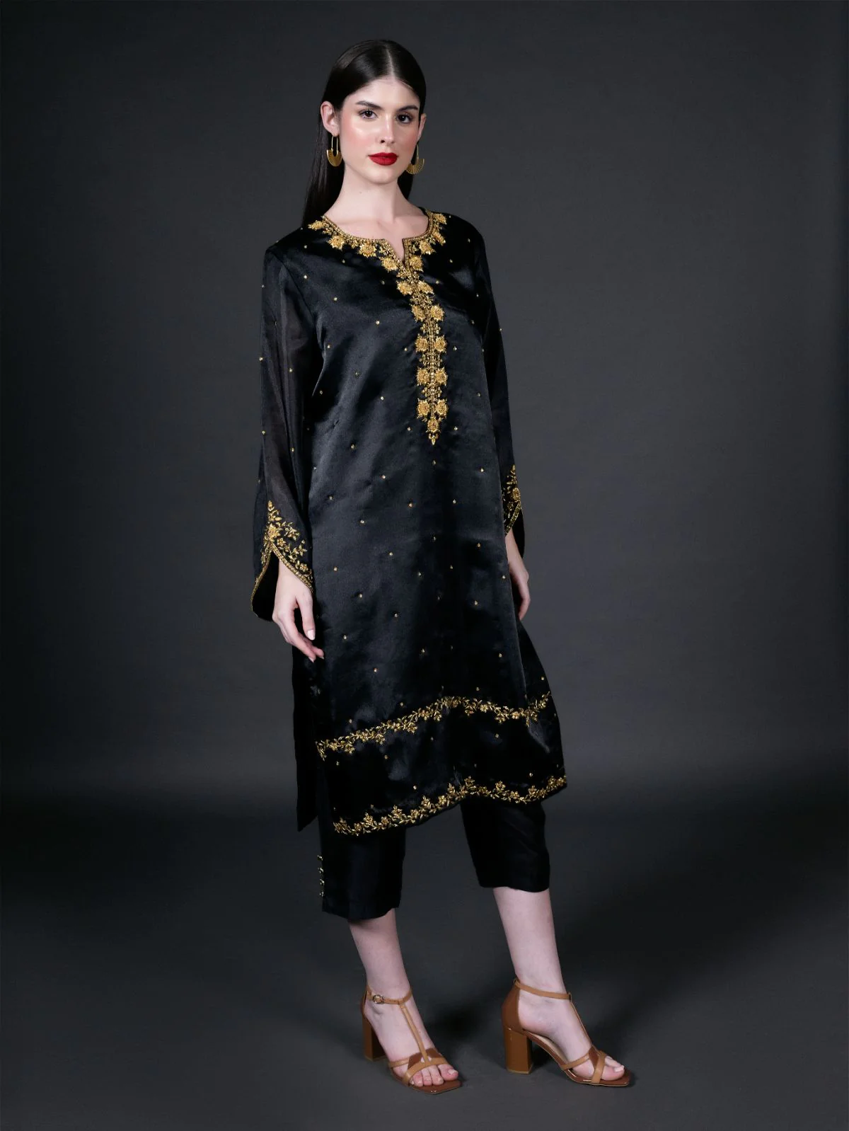Black Pearl Organza Kurta And Pants With Golden Zardozi Hand Embroidery