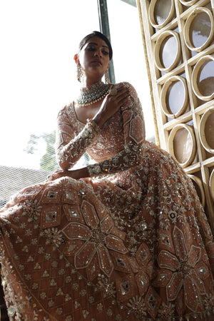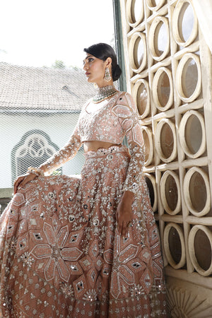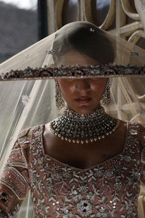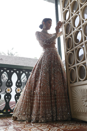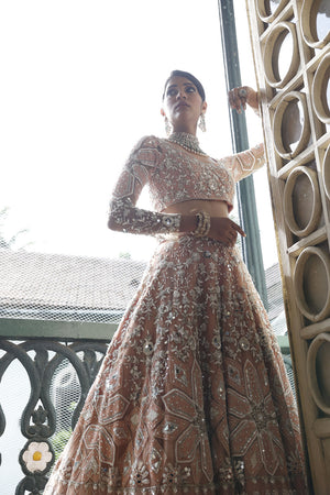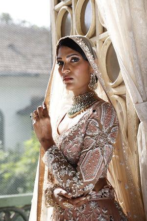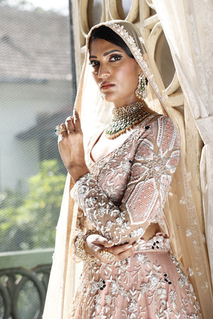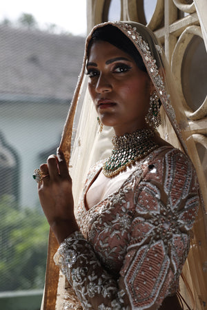Choli: Beige net embroidered choli with shaped neckline and full length sleeves. It is backless and has three tie ups with tassels for finishing. The choli front and back panels are lined with light pink silk. | Lehenga: Beige net lehenga in 24 kalis with embroidery and a cutwork waistbelt. The lehenga is lined with light pink silk. | Dupatta: Beige net Dupatta with embroidery in border from all over with buttis all over, the two pallas have cutwork on the borders and finished with tassels.
