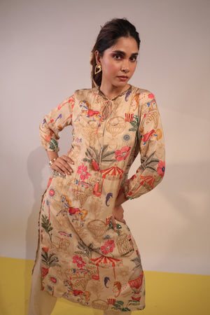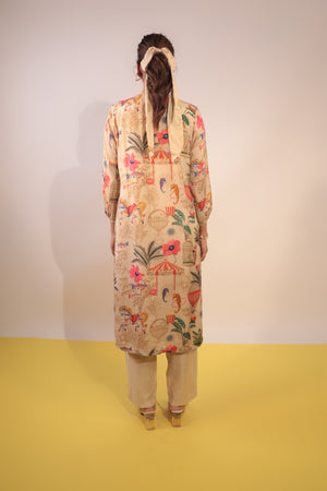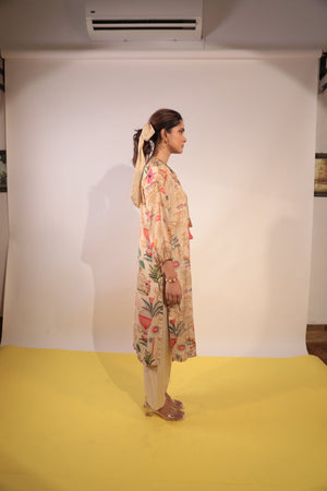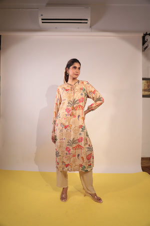 Hand Embroidered Custom Print Muslin Silk Kurti With Straight Pants.