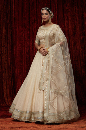 Featuring This Bage Cotton Chanderi Lahenga With Fine Gota Work. It'S Paired With Chanderi Blouse And Net Dupatta.