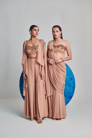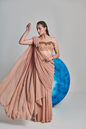 Beige Flared Pre- Stitch Drape Saree Set; Hand Embroidered With Katdana, Sequence, Beads; Back Closure For Blouse