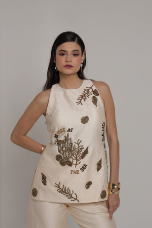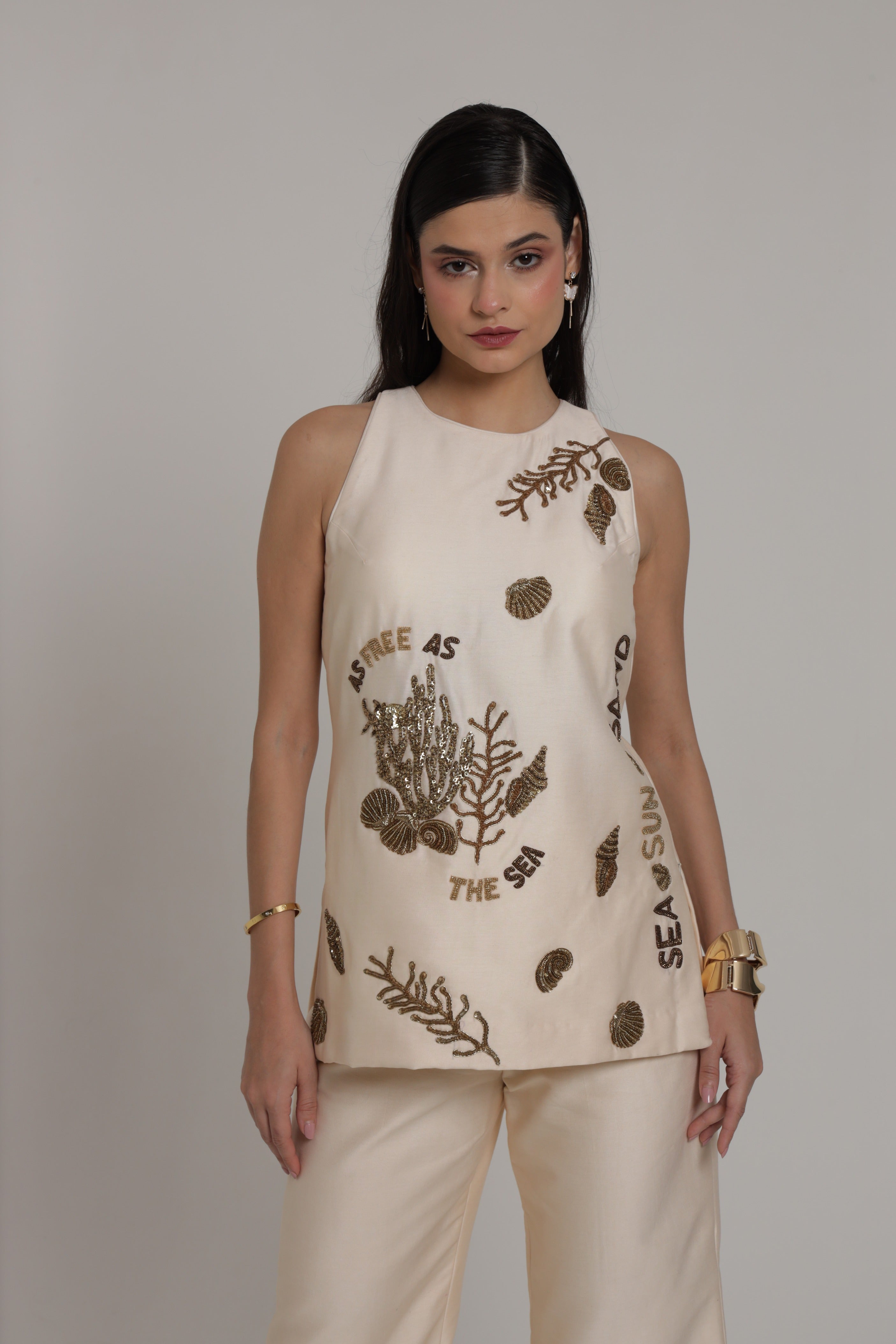 Halter neck top with wide leg pant . Antique gold sequence and cutdana hand embroidery done on the top.