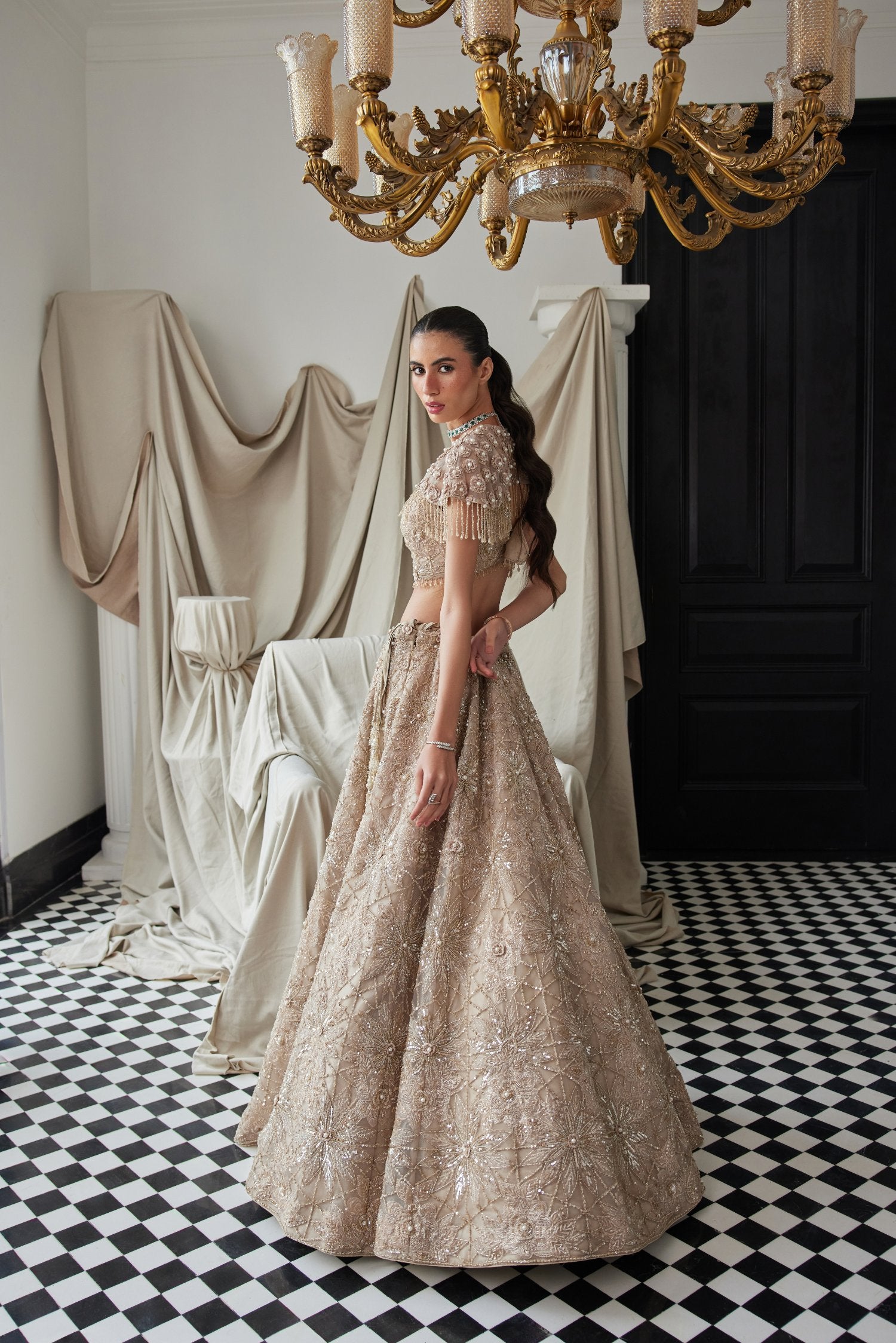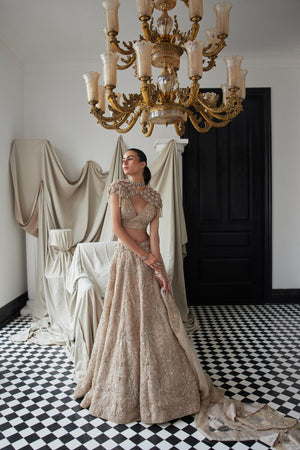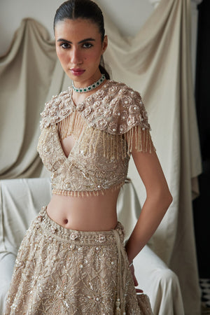 Beige flower-geometrical pattern heavy lehenga, embellished with threads, cutdanas and sequinz allong with heavy blouse, dupatta and a 3D flower cape