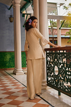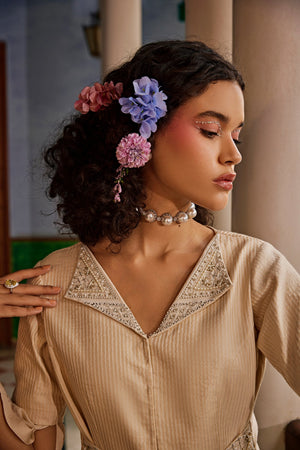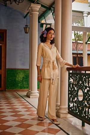 Experience sheer luxury with our light beige linen satin dobby co-ordinated set. Adorned with delicate pearl embroidery on the collar and a pearl-embellished belt, this ensemble epitomises elegance. Perfect for upscale gatherings, cocktail evenings, and sophisticated events. Elevate your presence with this exquisite attire, harmonizing opulence and style effortlessly. Model Info: