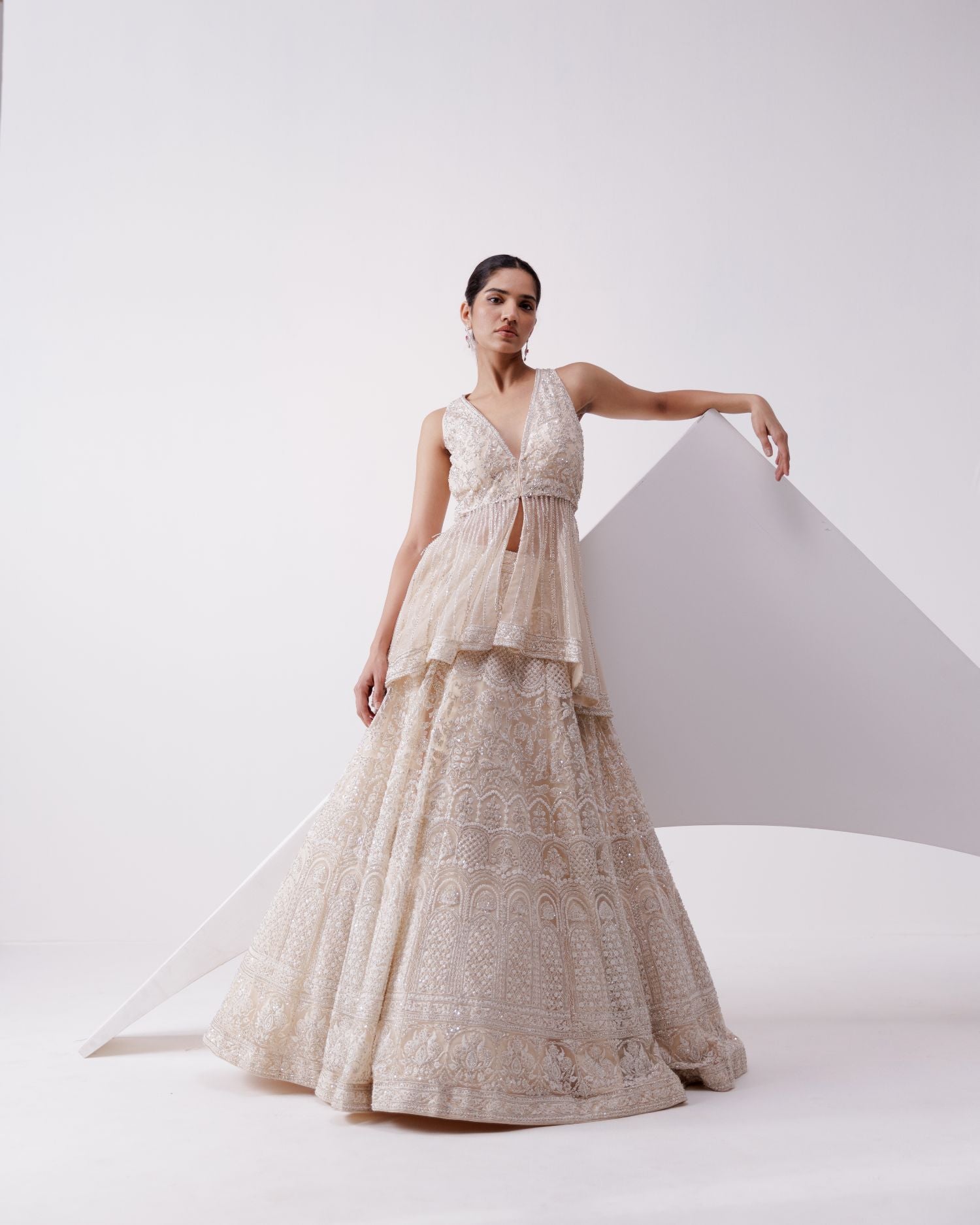 Beige Net Embroidered Lehenga With Peplum Jacket