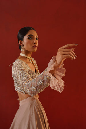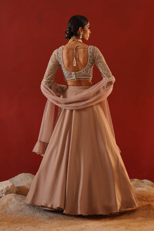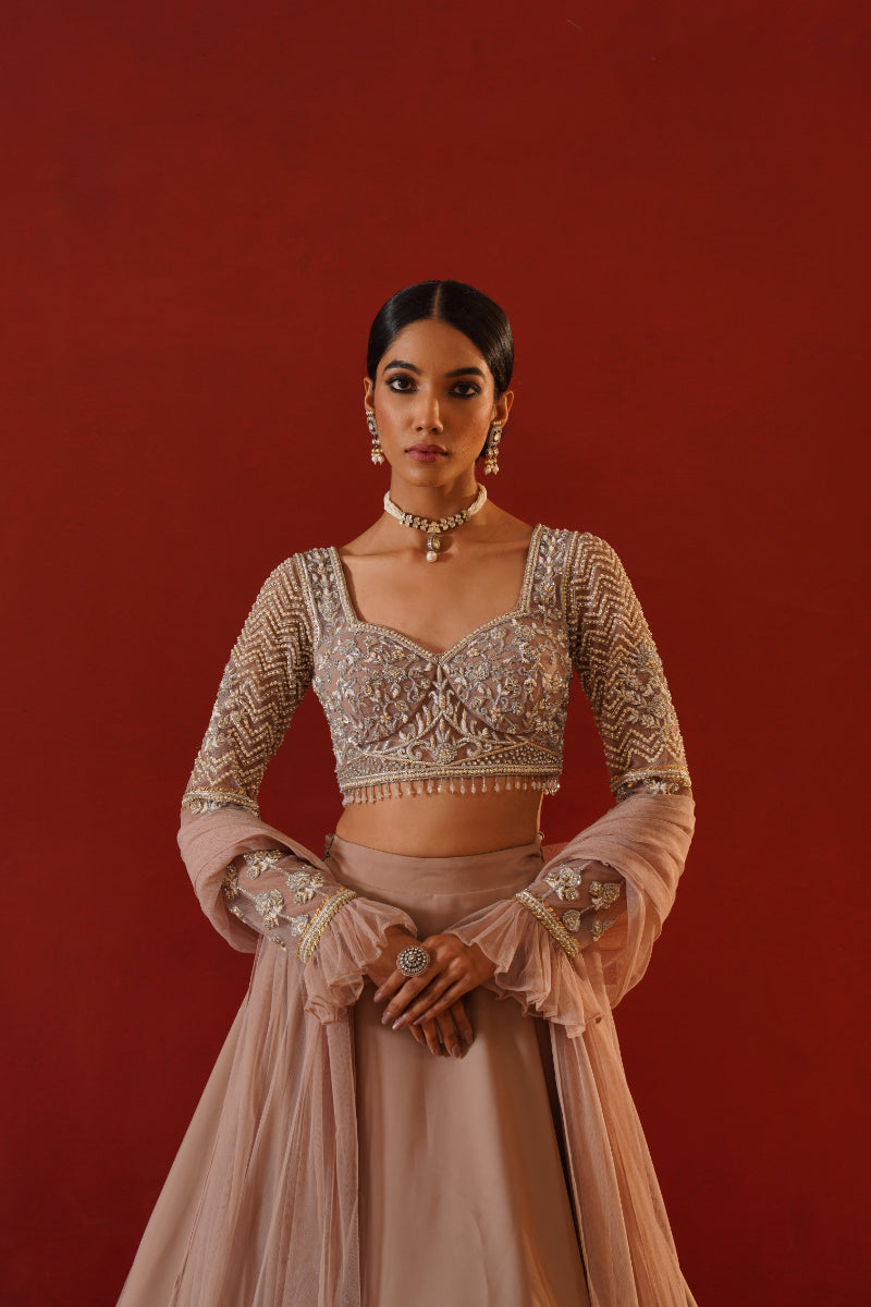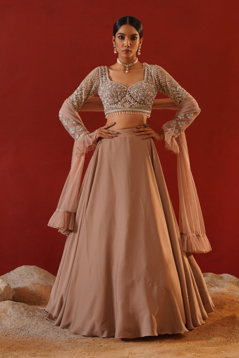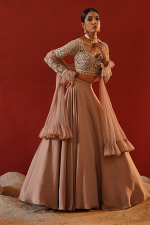 Kapda Dori's stunning beige armani satin lehenga. The beige color adds a touch of glamour and sophistication to your look, while the soft fabric ensures you feel comfortable all day or night long. It is styled with a beige net blouse hand embroidered with cutdana, crystals, stones and sequins. Pair it with complimenting beige net ruffle dupatta.