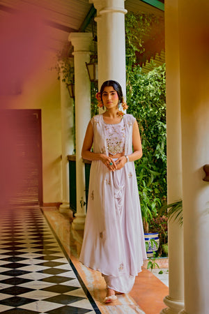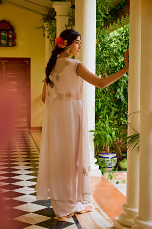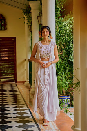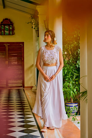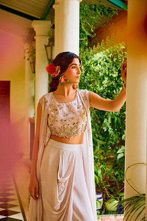 Discover unparalleled opulence with our exquisite ensemble: a light beigish grey georgette sleeveless cape jacket adorned with intricate flower bunch embroidery. Complemented by a satin pleated drape skirt featuring exquisite sequins, zardozi, and threadwork, paired elegantly with a cropped top. Elevate your style quotient with this luxurious blend of textures and artistry. Model Info: